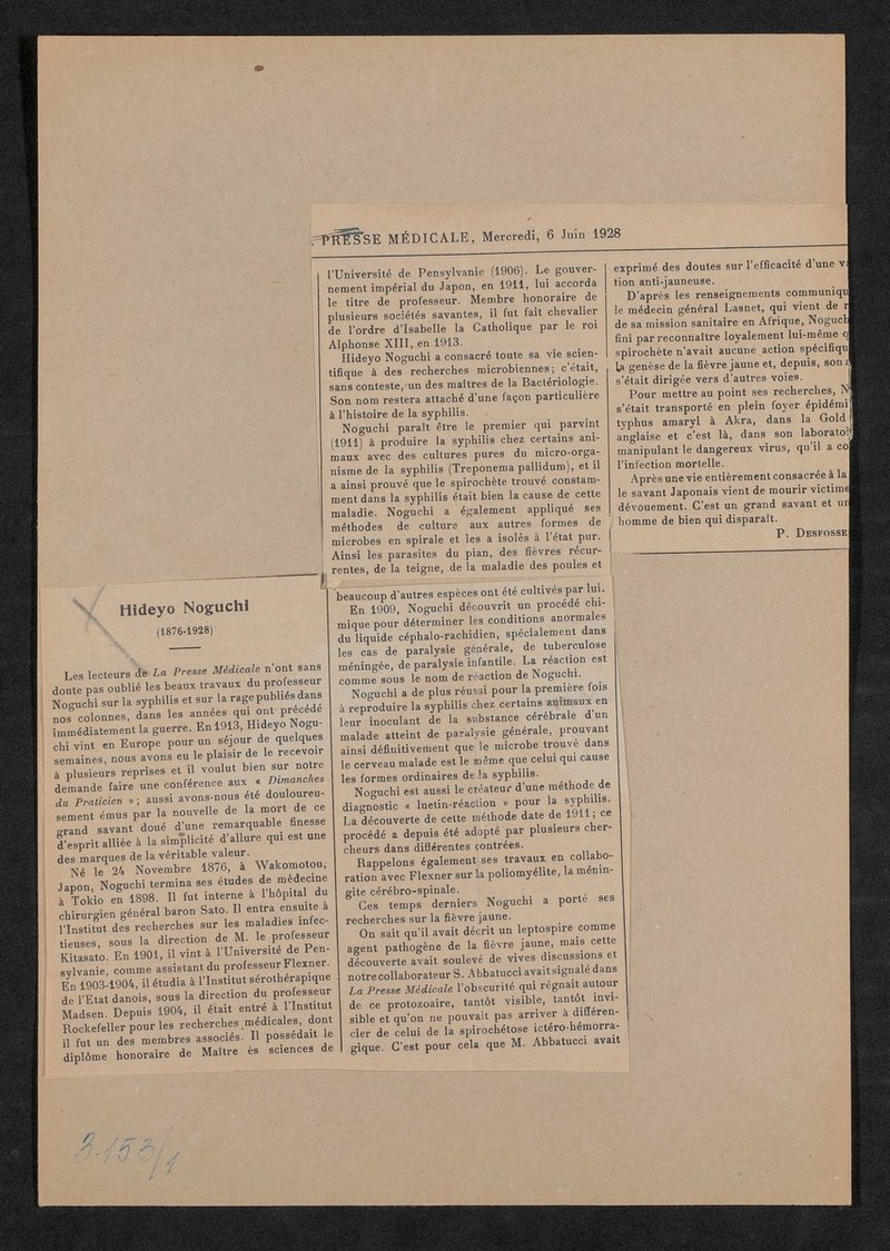 Auszug aus: Neues Wiener Journal, 1919. Auszug aus: La Presse Medicale, 06.06.1928. Bei diesem Zeitungsausschnitt handelt es sich um einen Nachruf.