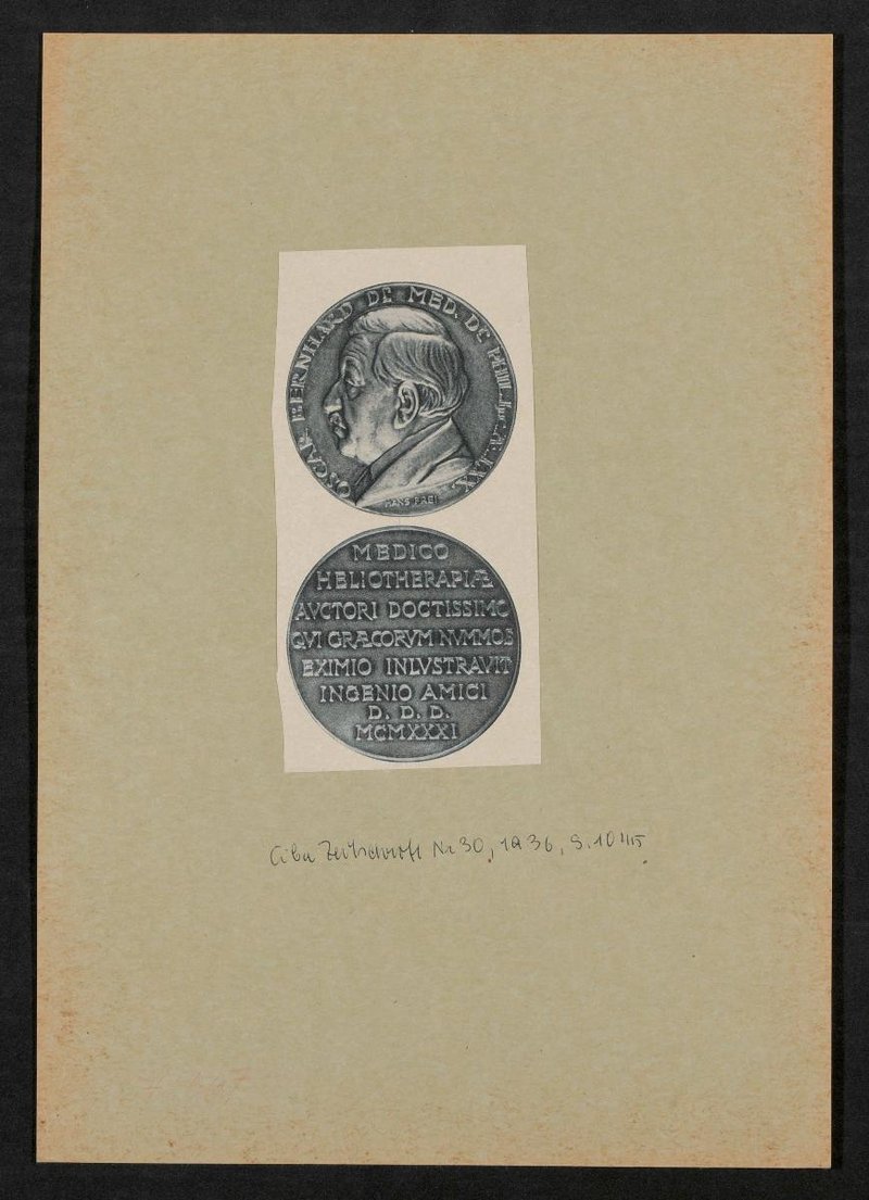 Mit einem Artikel auf der Rückseite, der die numismatischen Interessen von Bernhard zum Thema hat. Porträt und Artikel sind der Ciba-Zeitschrift, Bd. 30, 1936, S. 1045, entnommen worden.
