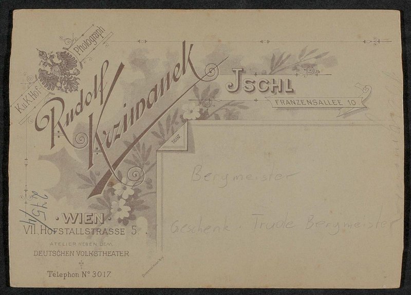 Die Fotografie wurde von Rudolf Krziwanek, Wien, angefertigt. Das Logo und das Muster auf der Rückseite des Bildes stammen vom Lithografen Bernhard Wachtl.