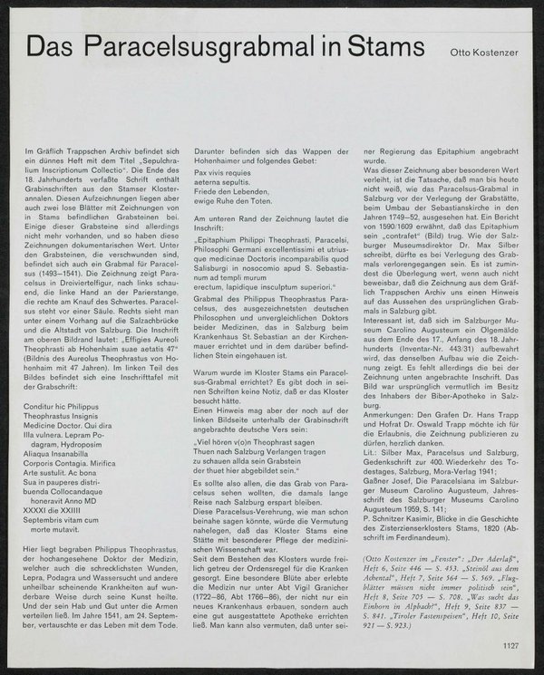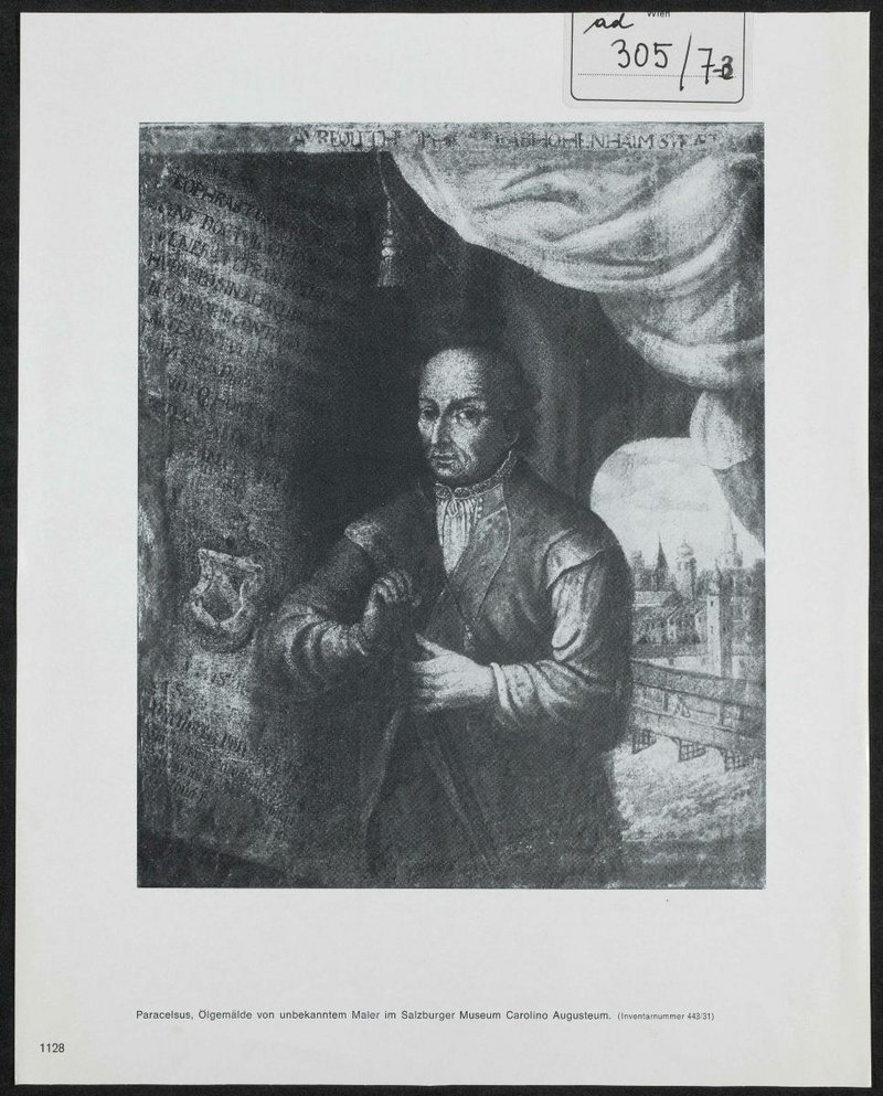 Kopie eines Ölgemäldes von Paracelsus, welches sich im Salzburg Museum befindet. Ausschnitt aus: Das Fenster. Tiroler Kulturzeitschrift, Nr. 12, Innsbruck 1973.