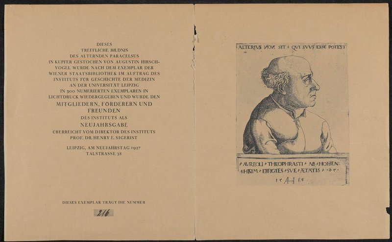 Nach einem Kupferstich von Augustin Hirschvogel. Gedruckt von Sinsel und Co. GmbH, Leipzig. Als Neujahrsausgabe des Instituts für Geschichte der Medizin Leipzig herausgegeben. Neg. (9x12) 630