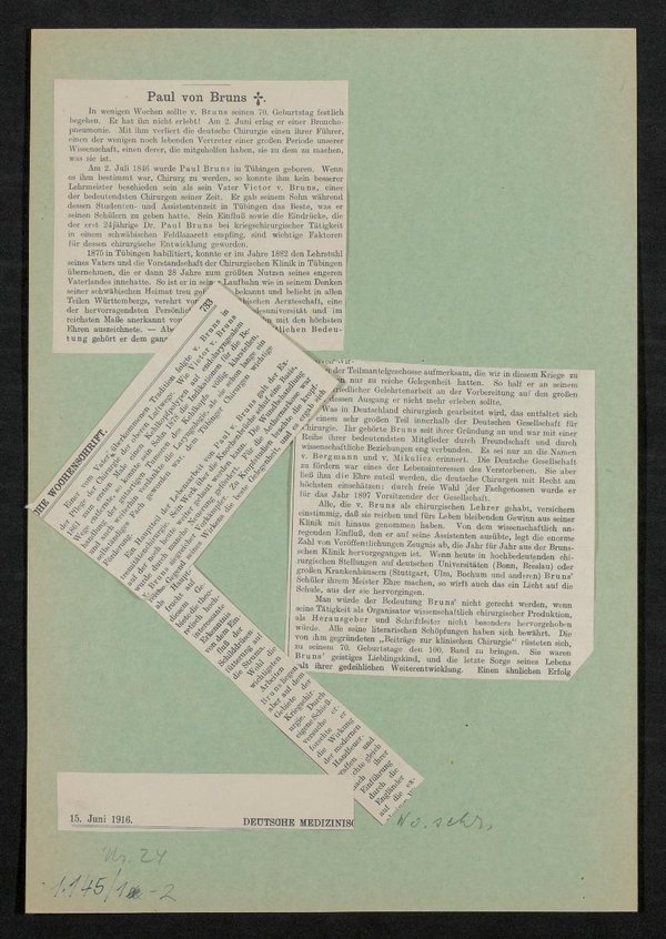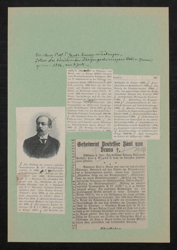 Das Porträt mit biographischen Angaben ist aus: Julius Leopold Pagel, Biographisches Lexikon hervorragender Ärzte des neunzehnten Jahrhunderts, Berlin/Wien 1901, S. 266. Daneben befindet sich ein Ausschnitt eines Nachrufs aus einer unbekannten Zeitung, 1916. Der auf der Rückseite angebrachte Nachruf ist aus: Deutsche Medizinische Wochenschrift, 1916, S. 733.