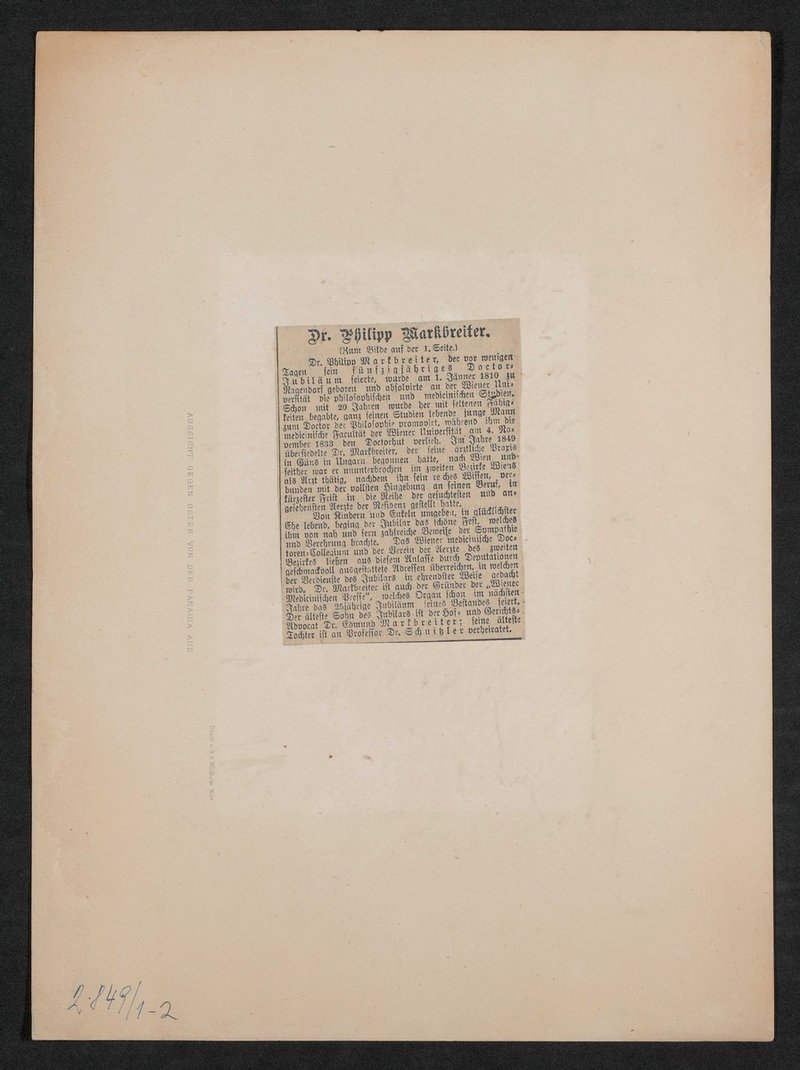 Auf der Vorderseite befindet sich ein Stempel des Instituts für Geschichte der Medizin, Wien.