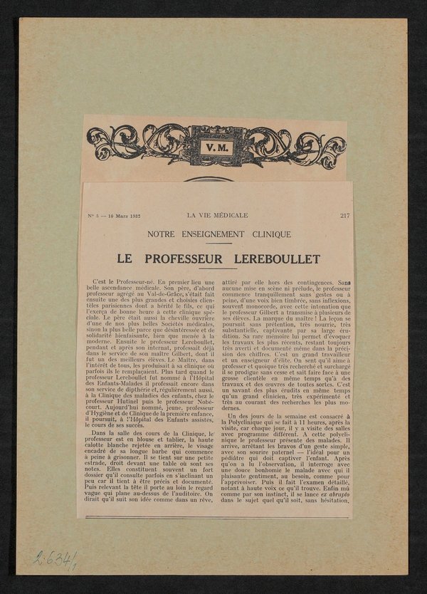 Die als Vorlage dienende Fotografie ist von Manuel Freres angefertigt worden. Die Vorlage des auf der Rückseite befestigten Porträts ist als von Henri Manuel stammend ausgewiesen. Beide Bilder und der Bericht sind der französischsprachigen Fachzeitschrift La Vie Medicale, Nr. 5, 10. März 1932, entnommen worden.