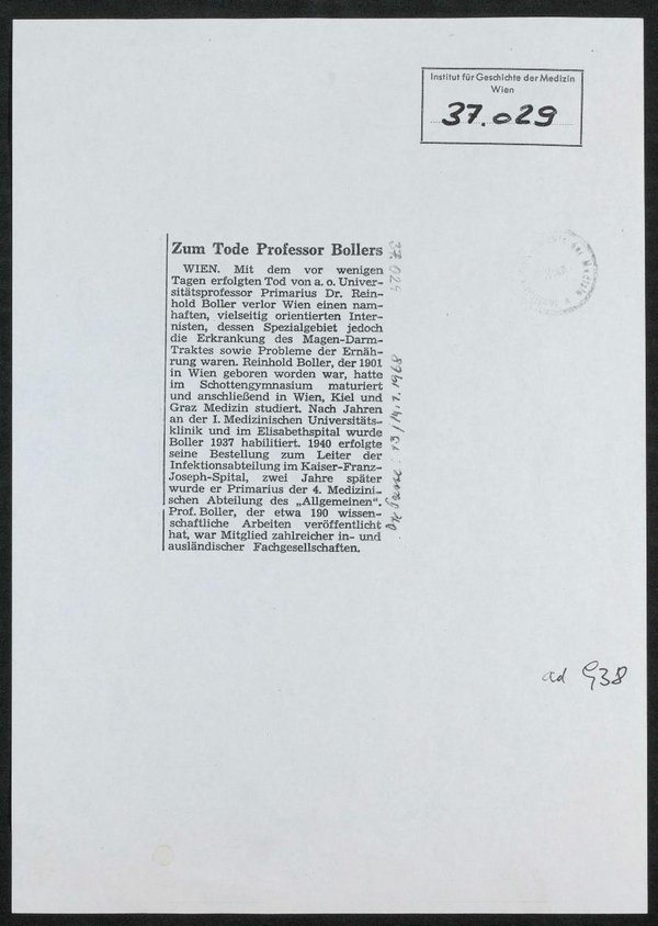 Ausschnitt aus: Große Österreich-Illustrierte. Dem Bild wurde eine Fotokopie eines Zeitungsausschnittes von einem Nachruf beigelegt, aus: Die Presse, vom 13/14. Januar 1968.
