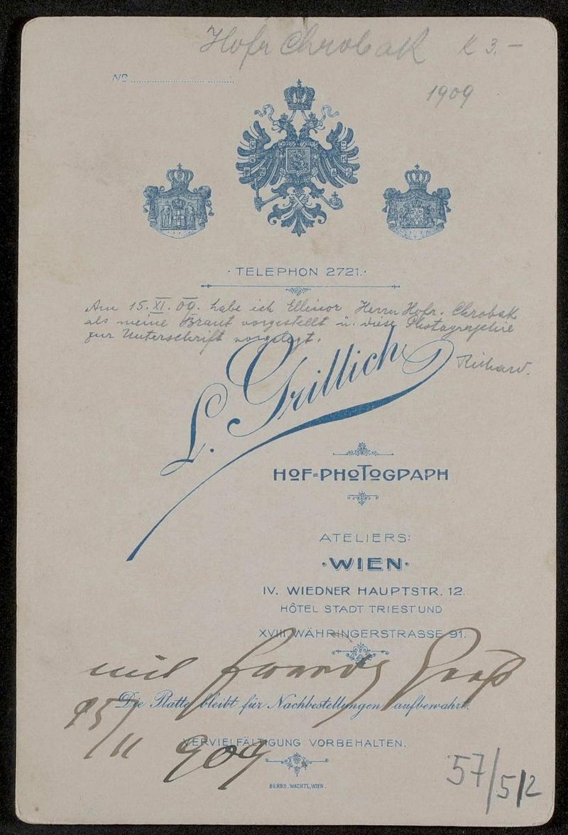 Die Fotografie wurde von Ludwig Grillich, Hofphotograph, Wien, angefertigt. Anlass für die rückseitige Grußadresse war, dass ein Mann namens Richard seine Ehefrau Rudolf Chrobak vorstellte.