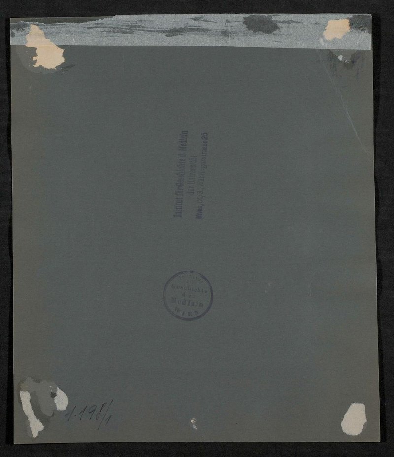 Vorderseitig mit einem Stempel des Instituts für Geschichte der Medizin, Wien, und zwei Stempeln der Kollektion Adam Politzer sowie rückseitig mit zwei Stempeln des Instituts für Geschichte der Medizin, Wien, versehen.