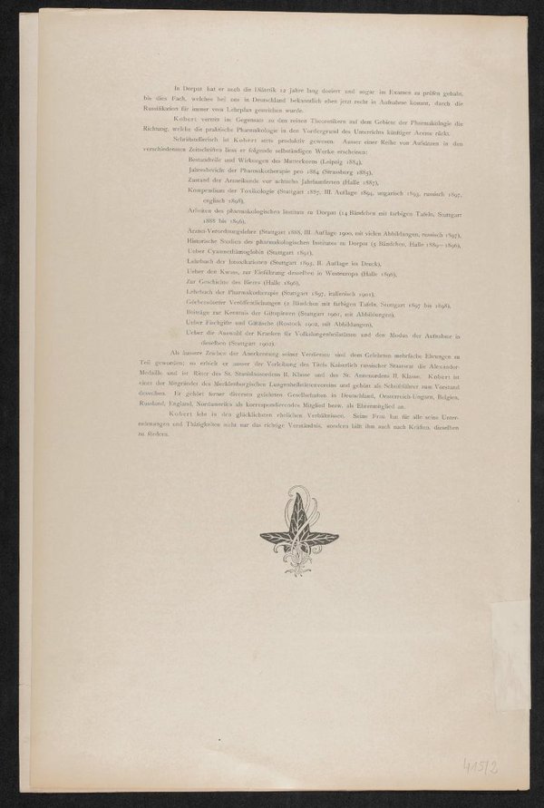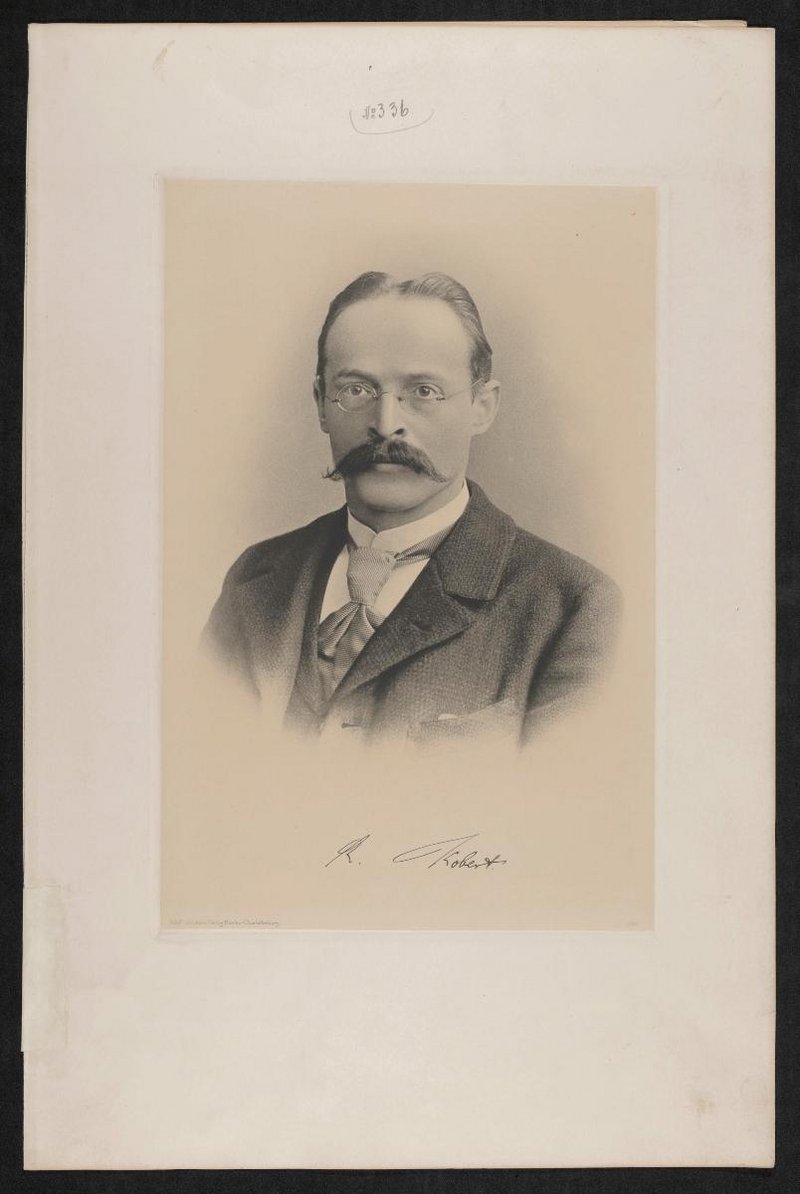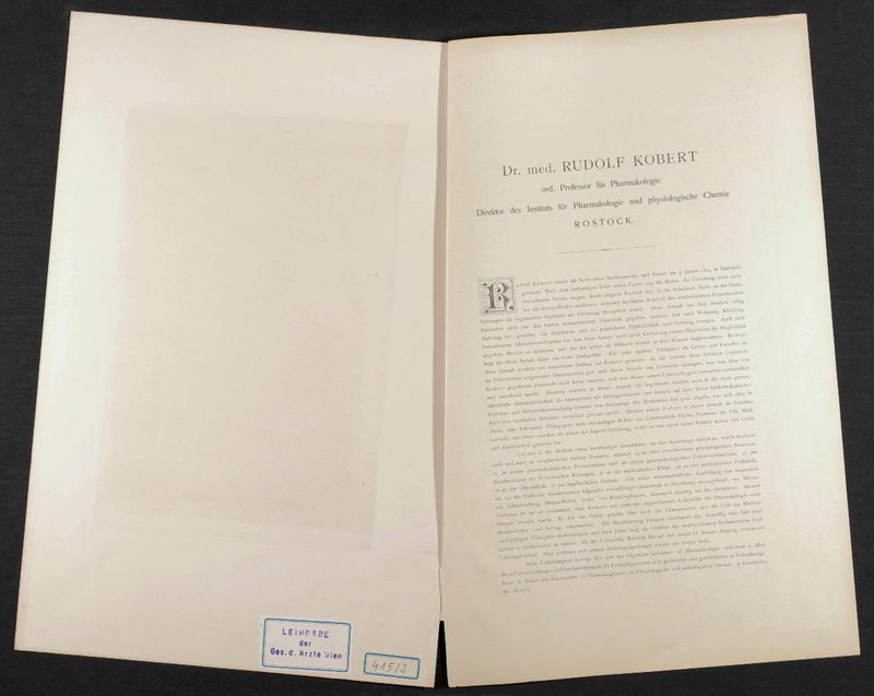 Die Heliogravüre wurde von Adolf Eckstein, Berlin-Charlottenburg, verlegt. An der Druckgrafik ist ein gedruckter Text zur Person Rudolf Kobert befestigt. Rückseitig befindet sich ein Stempel der Gesellschaft der Ärzte, Wien.