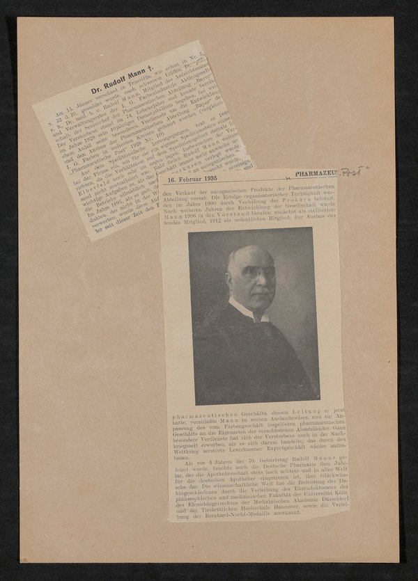 Als Vorlage diente eine Fotografie. Der Nachruf erschien in der Zeitung Pharmazeutische Post am 16. Februar 1935, enthält eine kurze Biographie und zählt Manns kaufmännische Verdienste auf.