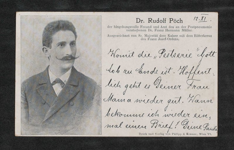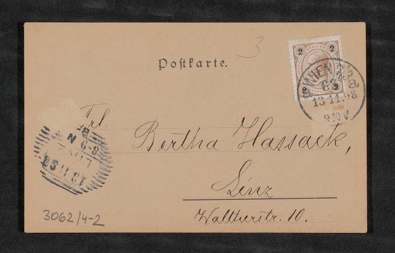 Das Bild wurde von Philipp und Kramer, Wien, gedruckt. Die Postkarte wurde an Bertha Hassack adressiert.