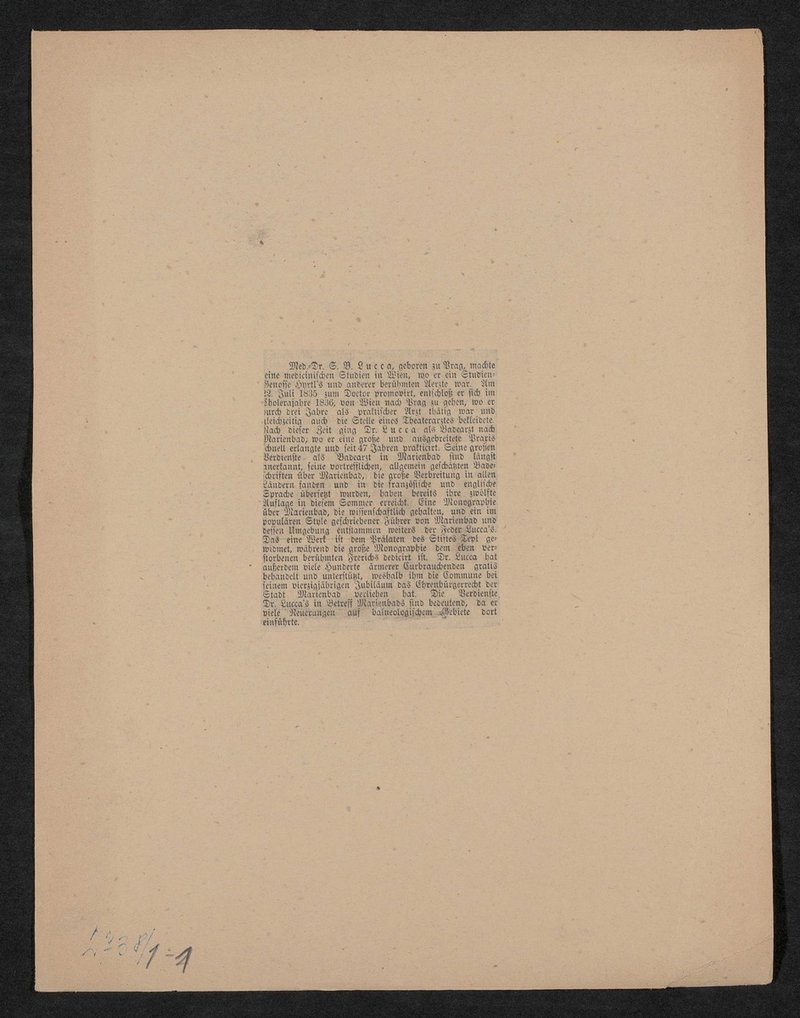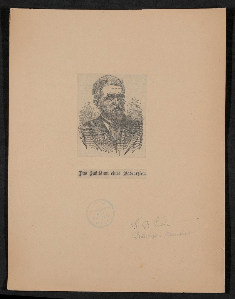 Als Vorlage diente eine Federzeichnung. Mit einem Bericht über seine fachlichen Leistungen auf der Rückseite. Unter dem Bild befindet sich ein Stempel des Institutes für Geschichte der Medizin, Wien.