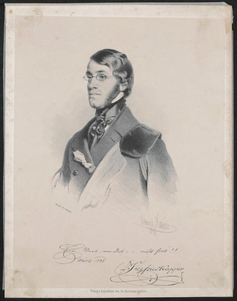 Der Sinnspruch lautet: Ein Wort, am Ort -- reißt fort!!, März 1848. Die Lithografie wurde von Eduard Kaiser, Wien, entworfen, bei B. J. Rauh gedruckt und bei Jos. Bergmann, Wien, verlegt.