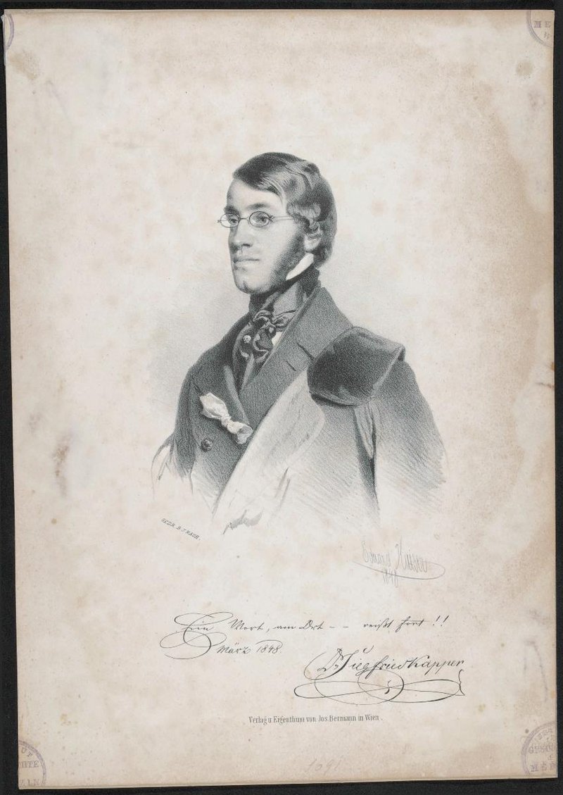 Der Sinnspruch lautet: Ein Wort, am Ort -- reißt fort!!, März 1848. Die Lithografie wurde von Eduard Kaiser, Wien, entworfen, bei B. J. Rauh gedruckt und bei Jos. Bergmann, Wien, verlegt.
