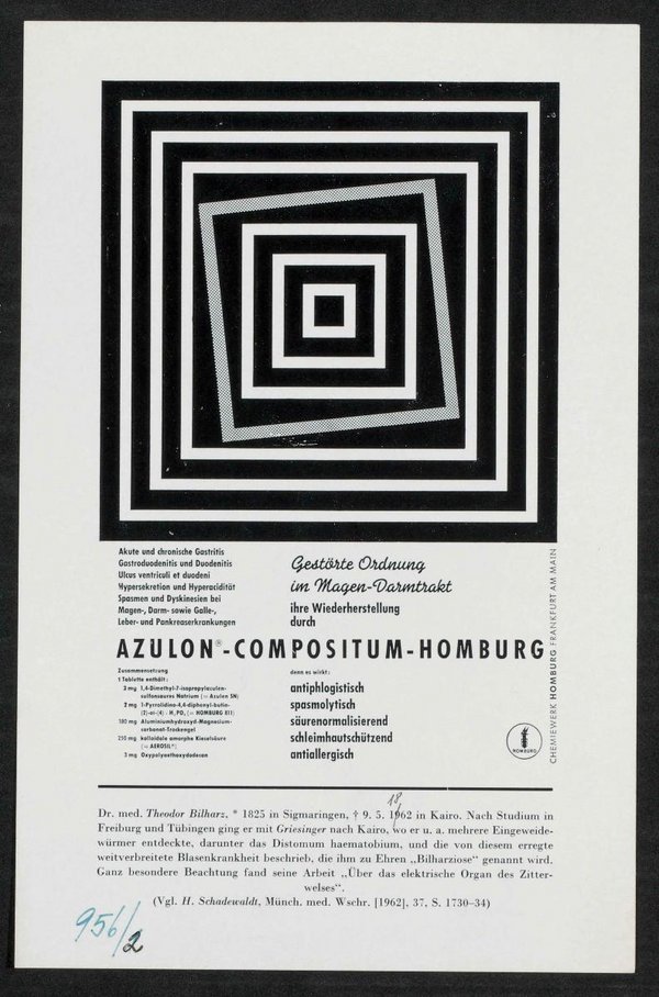 Mit lebensgeschichtlichen Informationen und Werbung für ein medizinisches Produkt auf der Rückseite. Auszug aus: Galerie hervorragender Ärzte und Naturforscher, in: Beilage zur Münchener medizinischen Wochenschrift, 1963, Bl. 686.