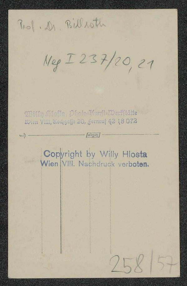 Die Fotografie wurde, wie der vorderseitige Prägestempel und die rückseitigen Stempel zeigen, von Willy Holsta, Photo-Kunst-Werkstätte, Wien, angefertigt. Neg I 257/20, 21