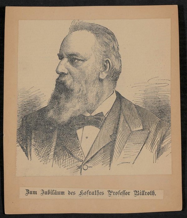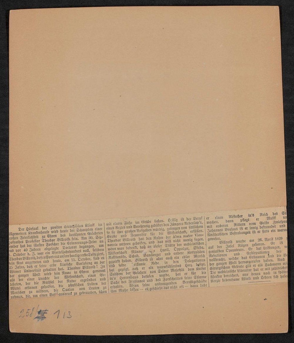 Auf der Rückseite ist ein Zeitungsausschnitt mit lebensgeschichtlichen Informationen zu Billroth angebracht.