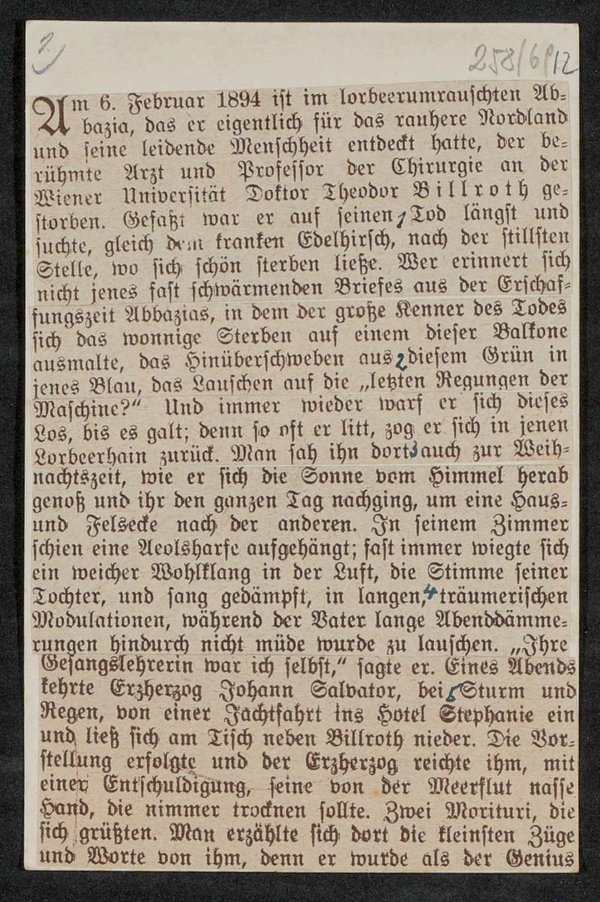 Der Ausschnitt ist vermutlich einem Artikel von Ernst Moritz Kronfeld entnommen worden, der anlässlich von Billroths 100. Geburtstag in der Wiener Zeitung erschienen ist.