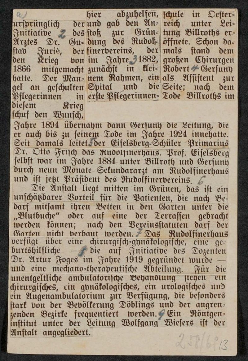 Der Ausschnitt ist vermutlich einem Artikel von Ernst Moritz Kronfeld entnommen worden, der anlässlich von Billroths 100. Geburtstag in der Wiener Zeitung erschien.