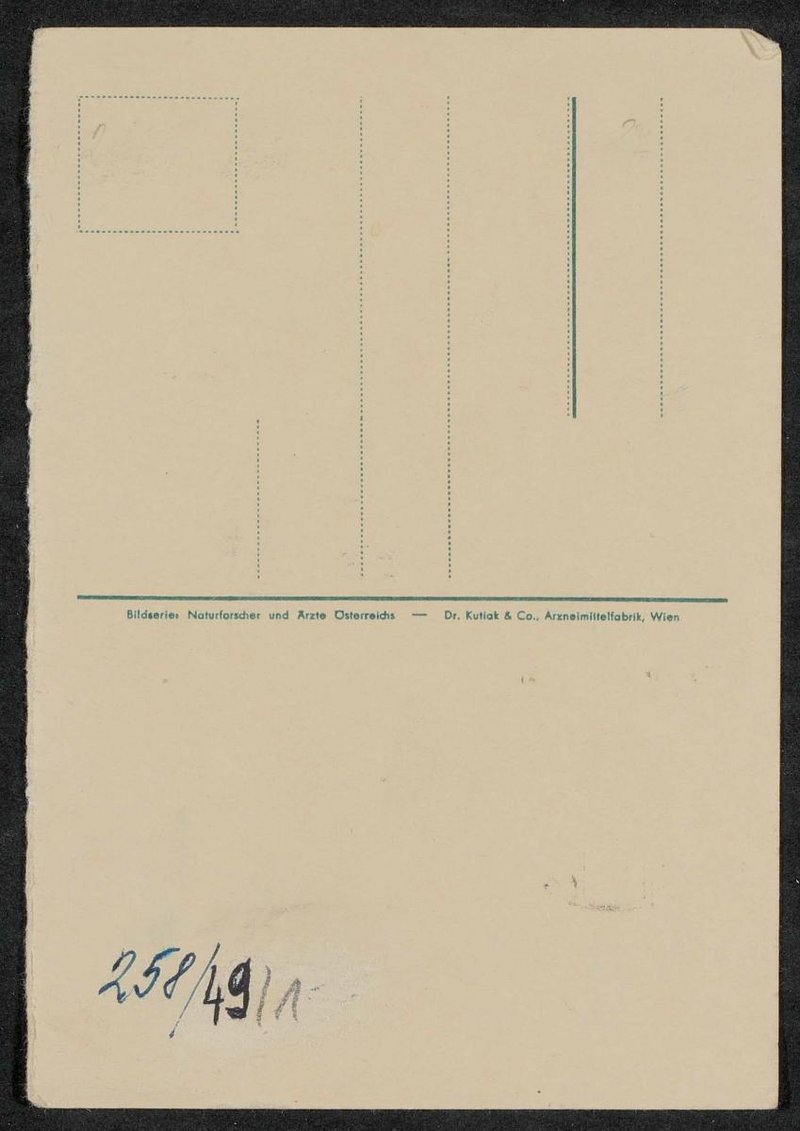 Die Postkarte wurde von der Dr. Kutiak und Co., Arzneimittelfabrik, Wien, in der Bilderserie Naturforscher und Ärzte Österreichs vertrieben.