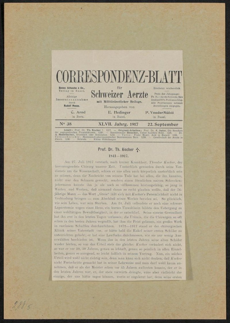 Kopie eines Porträts, das im Correspondenz-Blatt für Schweizer Ärzte, Bern-Base 1917, No. 38. erschienen ist.