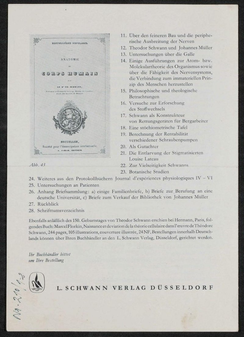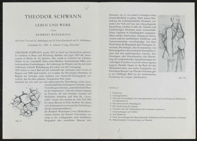 Es handelt sich um Werbematerial zu: Theodor Schwann. Leben und Werk, hg. von Rembert Watermann, Düsseldorf 1960.