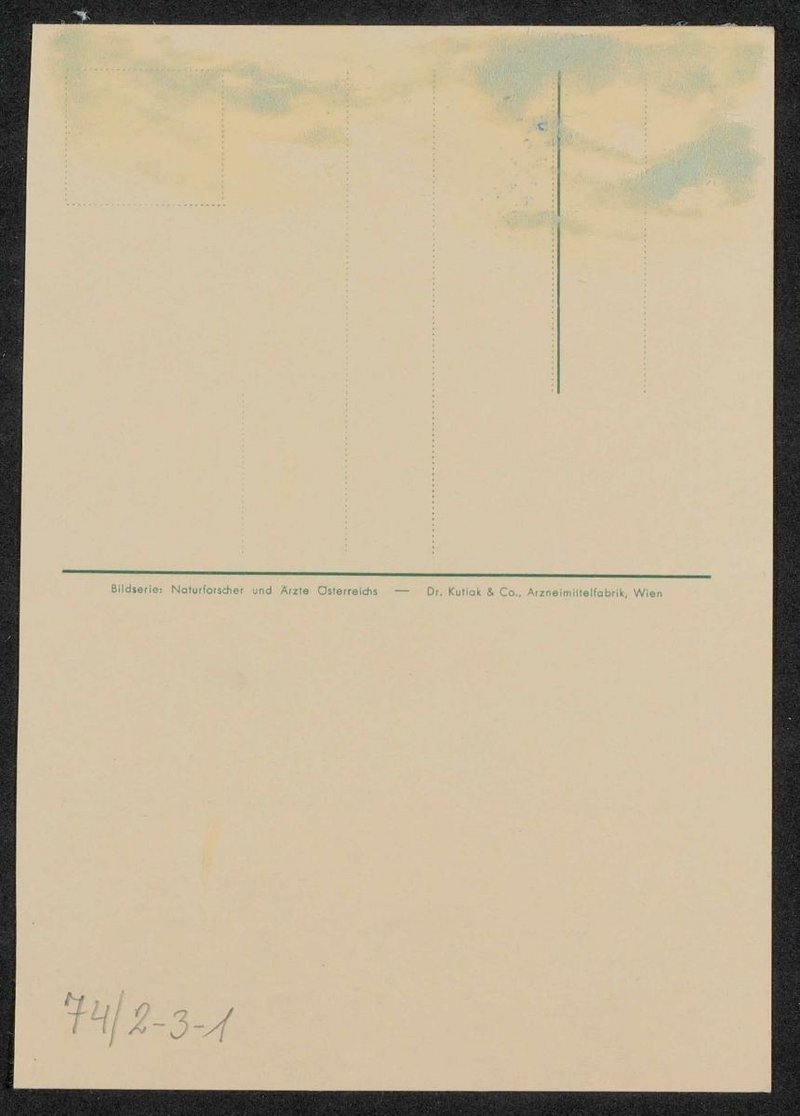 Die Ansichtskarte wurde von der Dr. Kutiak und Co., Arzneimittelfabrik, Wien, in der Bilderserie Naturforscher und Ärzte Österreichs vertrieben.