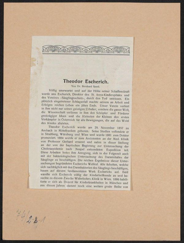 Ausschnitt eines Zeitungsartikels zum Tode des Abgebildeten, aus einer unbekannten Zeitung.