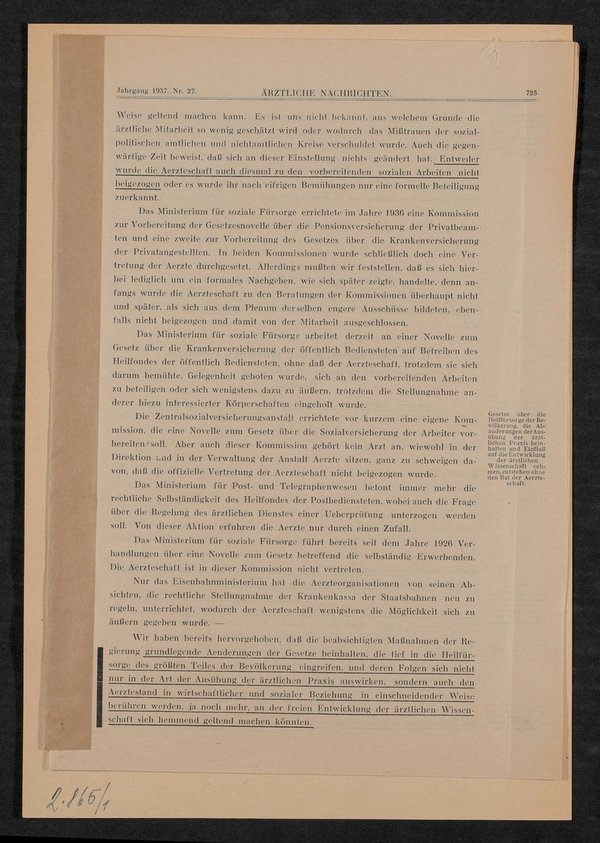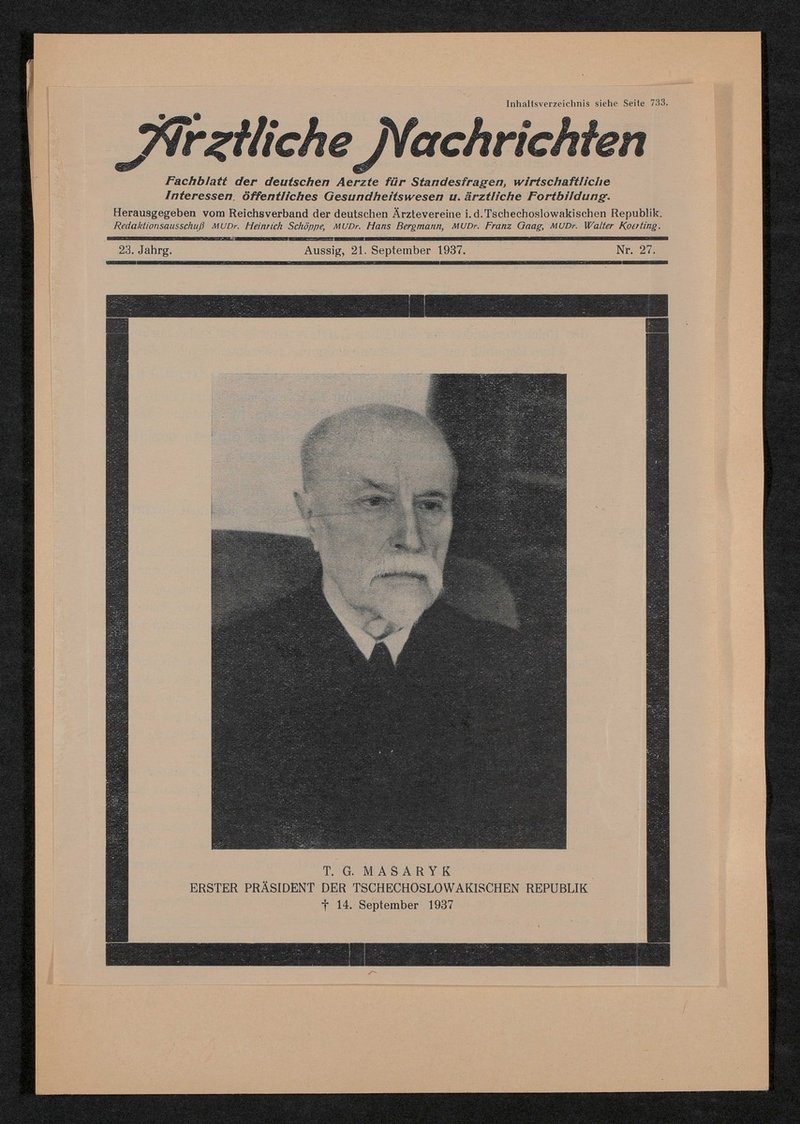 Auszug aus: Ärztliche Nachrichten. Fachblatt für Standesfragen, wirtschaftliche Interessen, öffentliches Gesundheitswesen und ärztliche Fortbildung, 23. Jg., Nr. 27, 21. September 1937, S. 721-734. Teil des Auszugs ist eine mehrseitige Stellungnahme der deutsch- und Tschechisch sprechenden Ärzt:innenschaft zu sozialpolitischen Gesetzesplänen der tschechoslowakischen Regierung.
