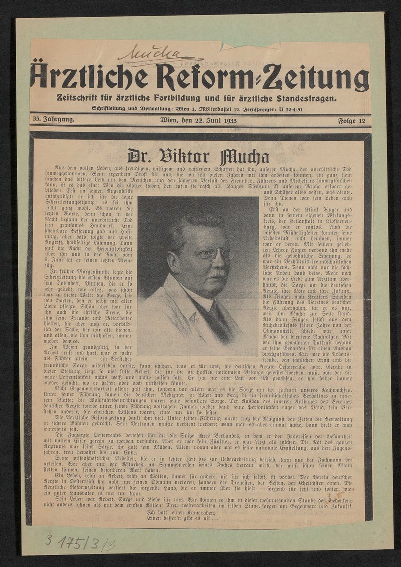 Reproduktion der Radierung von M. Steininger in der Ärztlichen Reform Zeitung, Nr. 35, 22.06.1933. Bei dem Zeitungsbericht handelt es sich um einen Nachruf.