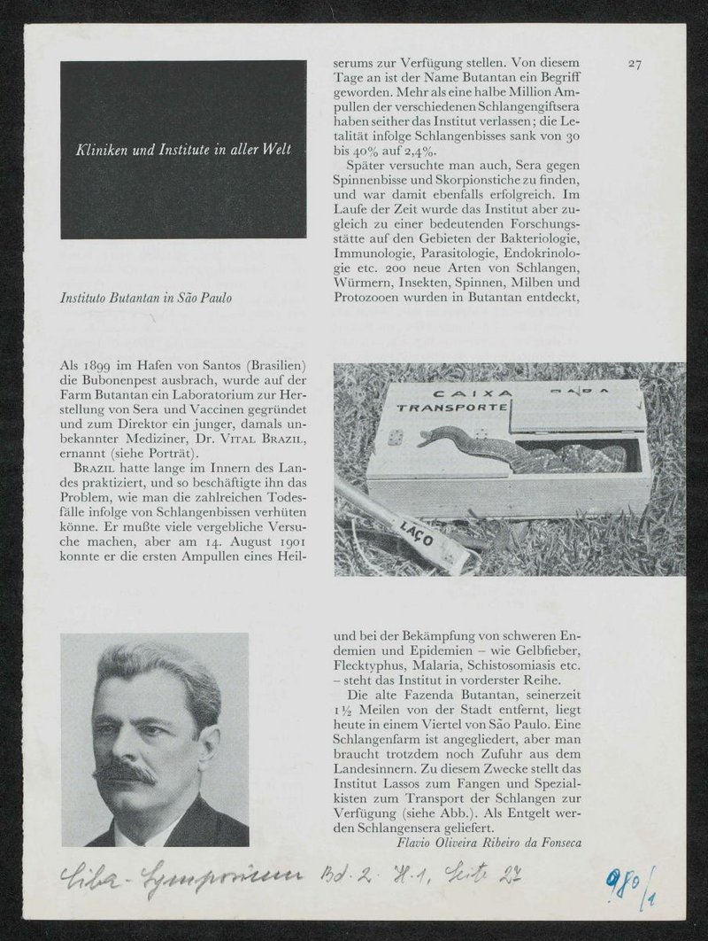 Der neben den Bildern abgedruckte Beitrag wurde von Flavio Oliveira Ribeiro da Fonseca verfasst. Er handelt vom 1901 gegründeten Instituto Butantan in São Paulo. Der Beitrag ist dem Ciba-Symposium, Bd. 2, Heft 1, S. 27, entnommen.