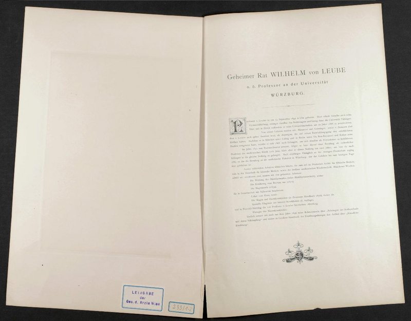 Die Lithografie wurde von Adolf Eckstein, Berlin-Charlottenburg, verlegt. Rückseitig befindet sich ein Stempel der Gesellschaft der Ärzte, Wien. An der Druckgrafik ist ein Text zur Person Wilhelm Olivier Leube befestigt.