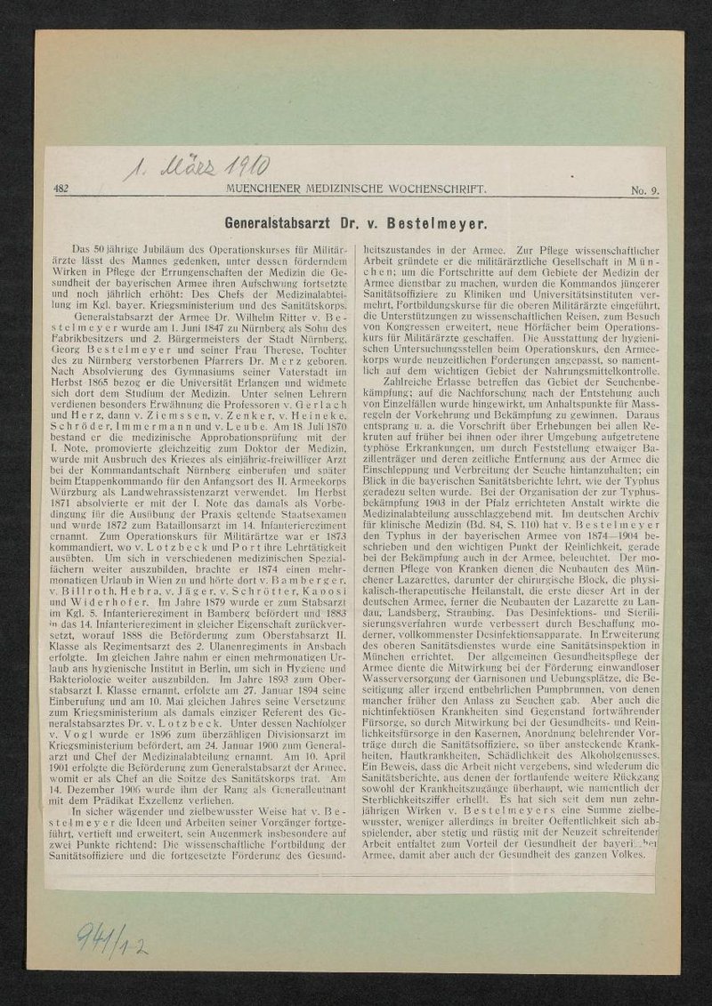 Auszug aus: Galerie hervorragender Ärzte und Naturforscher, in: Beilage zur Münchener medizinischen Wochenschrift, 1910, Bl. 262. Rückseitig befindet sich der zum Bild abgedruckte Beitrag.