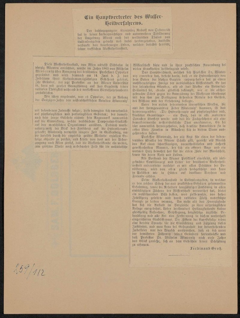 Mit einem Stempel des Instituts für Geschichte der Medizin, Wien, versehen. Auf der Rückseite ist der dem Ausschnitt zugehörige Artikel fixiert.
