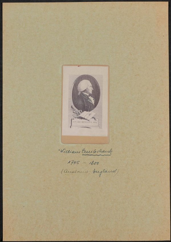 Reproduktion einer Radierung. Die unter dem Bild verzeichneten Daten beziehen sich auf den Mediziner und Anatomen William Cumberland Cruikshank, der häufig mit dem hier abgebildeten Chemiker und Militärarzt William Cruickshank, gestorben um 1810, verwechselt wird.