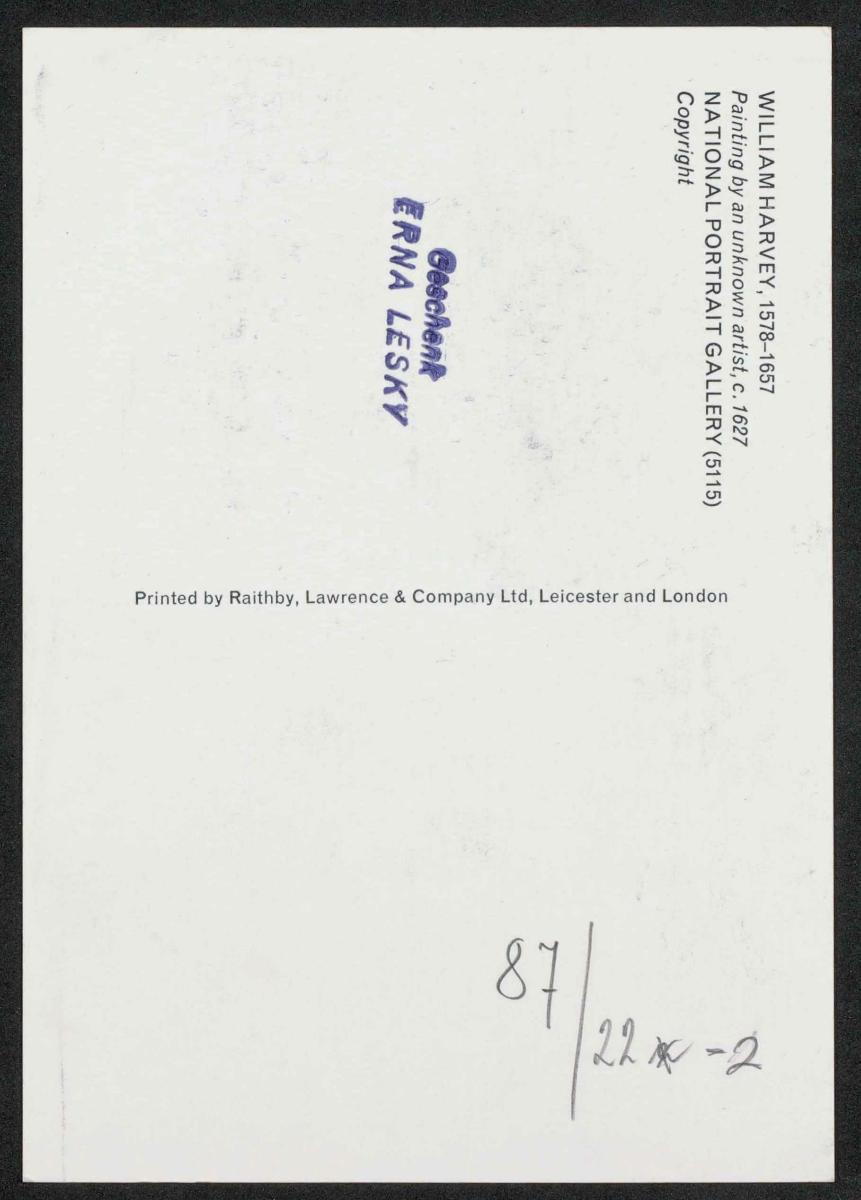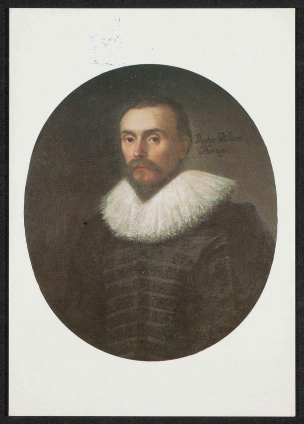 Ansichtskarte mit einem Porträt von William Harvey aus dem Jahr 1627, in der National Portrait Gallery. Ansichtskarte Gedruckt von Raithby, Lawrence and Company Ltd., Leicester and London.