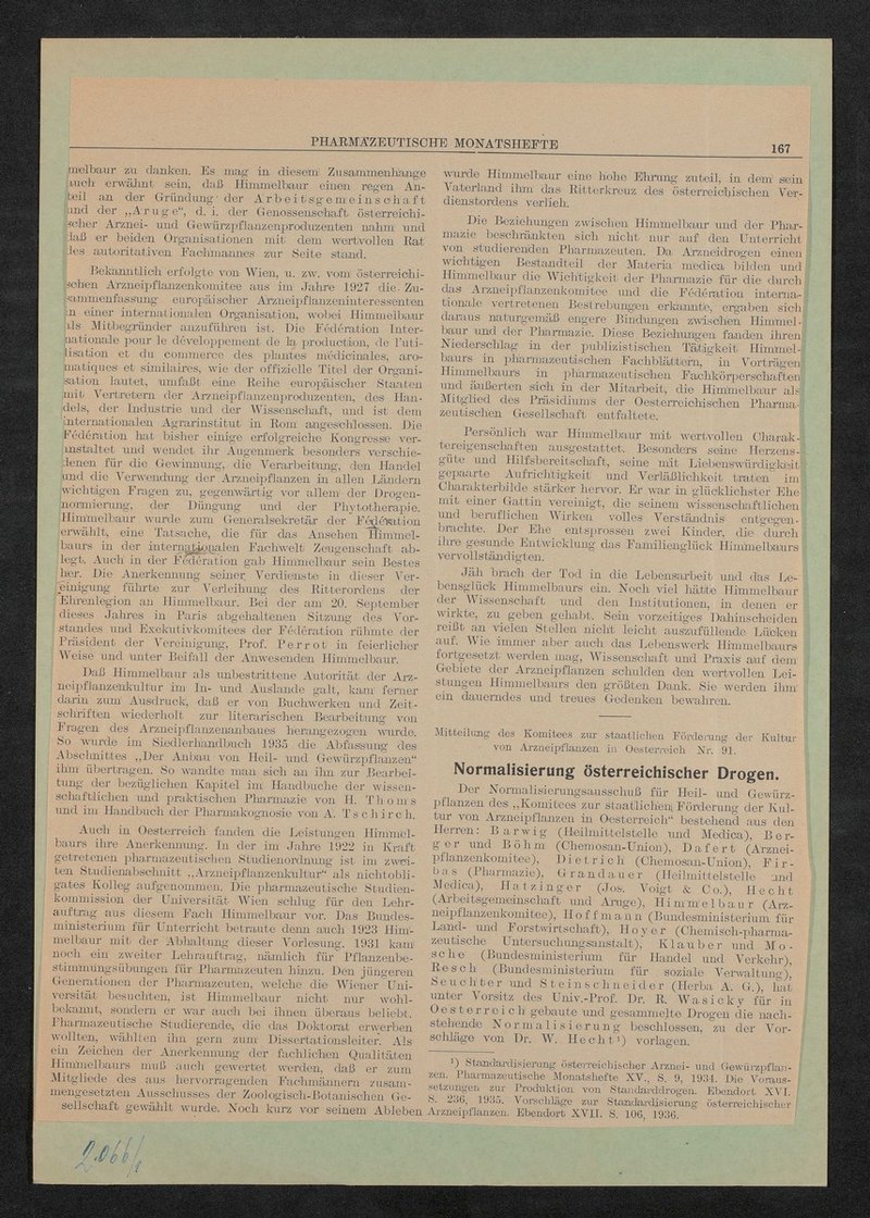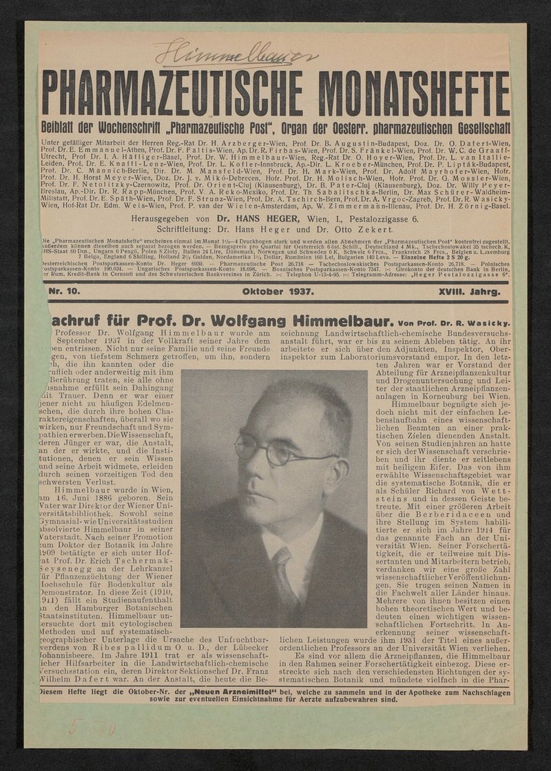 Auszug aus: Pharmazeutische Monatshefte, Beiblatt der Wochenschrift Pharmazeutische Post. Organ der Österreichisch pharmazeutischen Gesellschaft, Nr. 10, Oktober 1937, S. 166-168.