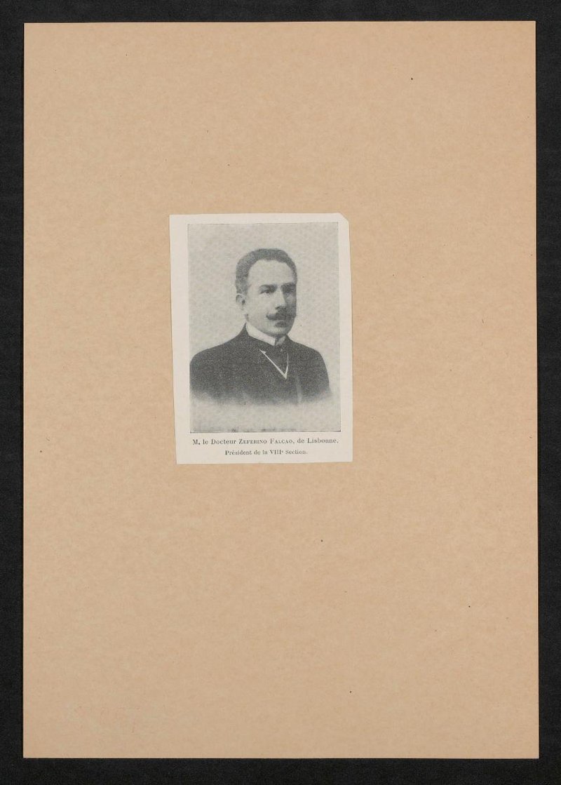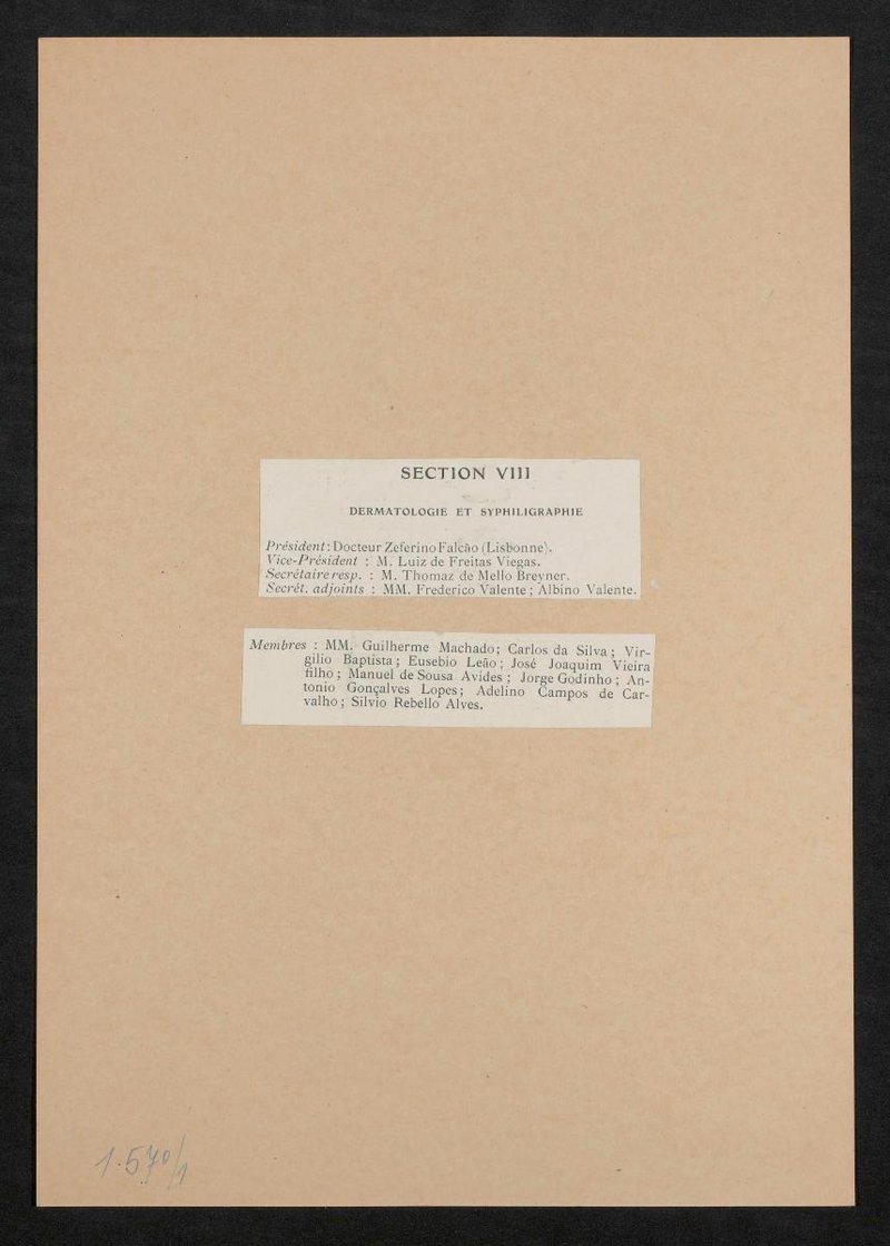 Die Bildunterschrift deutet darauf hin, dass der Ausschnitt einer französischsprachigen Unterlage zum 15. Internationalen Kongress für Medizin und Chirurgie in Lissabon im Jahr 1906 entstammt. Rückseitig befindet sich eine Aufstellung des Vorstands und der Mitglieder der Section de Dermatologie Et de Syphiligraphie.