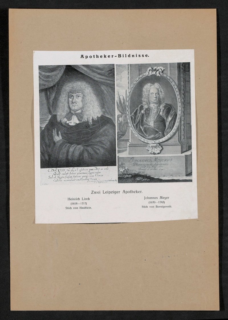 Reproduktionen von zwei Kupferstichen im Illustrierten Apotheker Kalender des deutschen Apotheker Vereines, Berlin. Der Kupferstich von Heinrich Linck wurde von Haublien angefertigt, und der Kupferstich von Johannes Meyer von Bernigeroth.