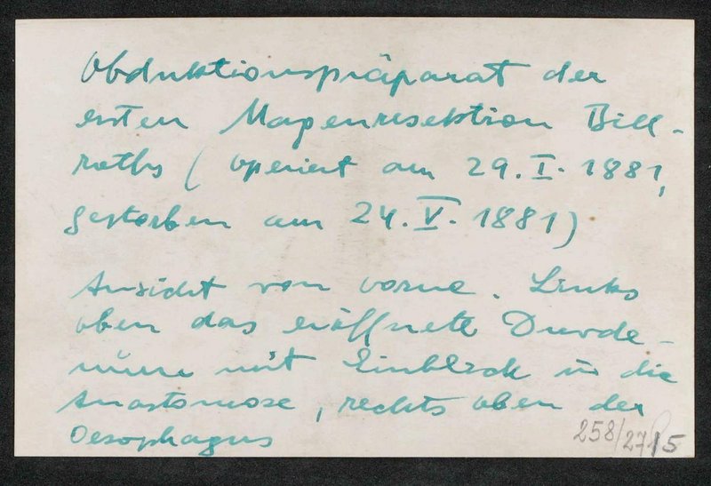 Mit handschriftlichen Erläuterungen auf der Rückseite. Das Präparat wurde im Pathologisch-anatomischen Museum Wien, dem heutigen Narrenturm, aufbewahrt. Neg II 117