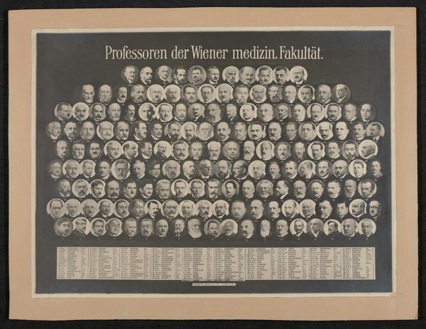 Abgebildet sind: Lauber, Hans, 1876-1952, Tandler, Julius, 1869-1936, Neumann, Heinrich, 1864-1939, Marschik, Hermann, 1878-1969, Frisch, Otto Ritter, 1877-1956, Klein, Salomon, 1845-1937, Bucura, Constantin, 1874-1935, Wagner-Jauregg, Julius, 1857-1940, Sternberg, Carl, 1872-1935, Lorenz, Hans, 1873-1934, Wasicky, Richard, 1884-1970, Fröhlich, Alfred, 1871-1953, Marburg, Otto, 1874-1948, Salzer, Hans, 1871-1944, Sachs, Moriz, 1865-1948, Raimann, Emil, 1872-1949, Schüller, Arthur, 1874-1957, Stein, Robert Otto, 1880-1951, Hajek, Markus, 1861-1941, Weibel, Wilhelm, 1876-1945, Haberda, Albin, 1868-1933, Frankl, Oskar, 1873-1938, Lotheissen, Georg, 1868-1941, Riehl, Gustav, 1855-1943, Wenckebach, Karl Frederik, 1864-1940, Schlesinger, Hermann, 1866-1934, Latzko, Wilhelm, 1863-1945, Wiesel, Josef, -1928, Ewald, Carl, 1865-1950, Mattauschek, Emil, 1870-1935, Fraenkel, Alexander, 1857-1941, Mayer, Otto, 1876-1951, Stigler, Robert, 1878-1975, Freund, Ernst, 1863-1946, Rubritius, Hans, 1876-1943, Schütz, Emil, 1853-, Pick, Ernst Peter, 1872-1960, Economo, Constantin von, 1876-1931, Graßberger, Roland, 1867-1956, Müller-Deham, Albert, 1881-1971, Schwarz, Gottwald, 1880-1959, Hockauf, Josef, 1860-1928, Lindner, Karl, 1883-1961, Kolmer, Walter, 1879-1931, Leiner, Carl, 1871-1930, Erben, Siegmund, 1863-, Sorgo, Josef, 1869-1950, Zappert, Julius, 1867-1942, Ruttin, Erich, 1880-1940, Spitzy, Hans, 1872-1956, Decastello-Rechtwehr, Alfred, 1872-1960, Mannaberg, Julius, 1860-1941, Reichel, Heinrich, 1876-1943, Reuss, August, 1879-1954, Meller, Josef, 1874-1968, Schaffer, Josef, 1861-1939, Hausmann, Walther, 1877-1938, Pichler, Hans, 1877-1949, Ullmann, Emerich, 1861-1937, Peham-Bojernberg, Heinrich Ritter, 1871-1930, Moll, Leopold, 1877-1933, Adler, Ludwig, 1878-1958, Löwenstein, Ernst, 1878-1950, Neuburger, Max, 1868-1955, Sachs, Otto, 1870-1927, Porges, Otto, 1879-1967, Pirquet von Cesenatico, Clemens Peter, 1874-1929, Schur, Heinrich, 1871-1953, Finsterer, Hans, 1877-1955, Hochstetter, Ferdinand, 1861-1954, Hochenegg, Julius von, 1859-1940, Jagić, Nikolaus von, 1875-1956, Blum, Viktor, 1877-1953, Sternberg, Maximilian, 1863-1934, Glaser, Erhard, 1870-1947, Eiselsberg, Anton von, 1860-1939, Winterberg, Heinrich, 1867-1929, Schilder, Paul, 1886-1940, Biehl, Karl, 1869-1945, Berze, Josef, 1866-1957, Bischoff, Ernst, 1868-1957, Lorenz, Adolf, 1854-1946, Falta, Wilhelm, 1875-1950, Mucha, Viktor, 1877-1935, Czyhlarz, Ernst von, 1873-1950, Werner, Paul, 1882-1955, Föderl, Oskar, 1866-1932, Fischel, Alfred, 1868-1938, Fabricius, Josef, 1865-1933, Finger, Ernest, 1856-1939, Denk, Wolfgang, 1882-1970, Fromm, Emil, 1865-1928, Fuchs, Ernst, 1851-1930, Hammerschlag, Victor, 1870-1943, Halban, Josef, 1870-1937, Glässner, Karl, 1876-1944, Fürth, Otto von, 1867-1938, Gaertner, Gustav, 1855-1937, Bauer, Richard, 1879-, Meixner, Karl, 1879-, Nowak, Josef, 1841-1886, Hochsinger, Carl, 1860-1942, Holzknecht, Guido, 1872-1931, Karplus, Johann Paul, 1866-1936, Knöpfelmacher, Wilhelm, 1866-1938, Kerl, Wilhelm, 1880-1945, Keitler, Heinrich, 1874-1937, Jehle, Ludwig, 1871-1939, Jellinek, Stefan, 1871-1968, Neumann, Wilhelm, 1877-1944, Přibram, Ernst, 1879-1940, Kraus, Rudolf, 1868-1932, Kren, Otto, 1876-1937, Bauer, Julius, 1887-1979, Nobl, Gabor, 1864-1938, Strasser, Alois, 1867-1945, Pupovac, Dominik, 1869-1929, Graff, Erwin, 1878-1952, Pappenheim, Martin, 1881-1943, Meyer, Hans Horst, 1853-1939, Pick, Alois, 1859-1945, Kienböck, Robert, 1871-1953, Sträussler, Ernst, 1872-1959, Pilcz, Alexander, 1871-1954, Schnitzler, Julius, 1865-1939, Pal, Jakob, 1863-1936, Oppenheim, Moritz, 1876-1949, Glas, Emil, 1877-1958, Arzt, Leopold, 1883-1955, Volk, Richard, 1876-1944, Pauli, Wolfgang, 1869-1955, Wunschheim-Lilienthal, Gustav Ritter, 1865-1938, Weiser, Rudolf, -1928, Luithlen, Friedrich, 1869-1927, Peters, Hubert, 1859-1934, Piskaček, Ludwig, 1854-1932, Ortner-Bodenstaedt, Norbert Ritter, 1865-1935, Mandl, Ludwig, 1862-1937, Kermauner, Fritz, 1872-1931 Freund, Leopold, 1868-1943 Kaufmann, Rudolf, 1871-1927 Büdinger, Konrad, 1867-1944 Grossman, Michael, 1848-1927 Redlich, Emil, 1866-1930 Harmer, Leopold, 1869-1945 Weinberger, Maximilian, 1875-1954 Chvostek, Franz, 1864-1944 Fronz, Emil, 1860-1930 Durig, Arnold, 1872-1961 Maresch, Rudolf, 1868-1936 Rothberger, Karl Julius, 1871-1945 Frey, Hugo, 1873-1951 Alexander, Gustav, 1873-1932 Russ, Viktor Karl, 1879-1956 Stransky, Erwin, 1877-1962 Nobel, Edmund, 1883-1946 Gomperz, Benjamin, 1861-1935 Knaffl-Lenz-Fohnsdorff, Erich Ritter, 1880-1962 Hanke, Viktor, 1871-1945 Kovács, Friedrich, 1861-1931.