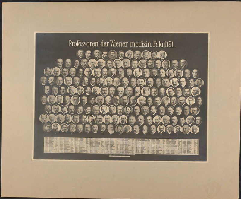 Abgebildet sind: Lauber, Hans, 1876-1952, Tandler, Julius, 1869-1936, Neumann, Heinrich, 1864-1939, Marschik, Hermann, 1878-1969, Frisch, Otto Ritter, 1877-1956, Klein, Salomon, 1845-1937, Bucura, Constantin, 1874-1935, Wagner-Jauregg, Julius, 1857-1940, Sternberg, Carl, 1872-1935, Lorenz, Hans, 1873-1934, Wasicky, Richard, 1884-1970, Fröhlich, Alfred, 1871-1953, Marburg, Otto, 1874-1948, Salzer, Hans, 1871-1944, Sachs, Moriz, 1865-1948, Raimann, Emil, 1872-1949, Schüller, Arthur, 1874-1957, Stein, Robert Otto, 1880-1951, Hajek, Markus, 1861-1941, Weibel, Wilhelm, 1876-1945, Haberda, Albin, 1868-1933, Frankl, Oskar, 1873-1938, Lotheissen, Georg, 1868-1941, Riehl, Gustav, 1855-1943, Wenckebach, Karl Frederik, 1864-1940, Schlesinger, Hermann, 1866-1934, Latzko, Wilhelm, 1863-1945, Wiesel, Josef, -1928, Ewald, Carl, 1865-1950, Mattauschek, Emil, 1870-1935, Fraenkel, Alexander, 1857-1941, Mayer, Otto, 1876-1951, Stigler, Robert, 1878-1975, Freund, Ernst, 1863-1946, Rubritius, Hans, 1876-1943, Schütz, Emil, 1853-, Pick, Ernst Peter, 1872-1960, Economo, Constantin von, 1876-1931, Graßberger, Roland, 1867-1956, Müller-Deham, Albert, 1881-1971, Schwarz, Gottwald, 1880-1959, Hockauf, Josef, 1860-1928, Lindner, Karl, 1883-1961, Kolmer, Walter, 1879-1931, Leiner, Carl, 1871-1930, Erben, Siegmund, 1863-, Sorgo, Josef, 1869-1950, Zappert, Julius, 1867-1942, Ruttin, Erich, 1880-1940, Spitzy, Hans, 1872-1956, Decastello-Rechtwehr, Alfred, 1872-1960, Mannaberg, Julius, 1860-1941, Reichel, Heinrich, 1876-1943, Reuss, August, 1879-1954, Meller, Josef, 1874-1968, Schaffer, Josef, 1861-1939, Hausmann, Walther, 1877-1938, Pichler, Hans, 1877-1949, Ullmann, Emerich, 1861-1937, Peham-Bojernberg, Heinrich Ritter, 1871-1930, Moll, Leopold, 1877-1933, Adler, Ludwig, 1878-1958, Löwenstein, Ernst, 1878-1950, Neuburger, Max, 1868-1955, Sachs, Otto, 1870-1927, Porges, Otto, 1879-1967, Pirquet von Cesenatico, Clemens Peter, 1874-1929, Schur, Heinrich, 1871-1953, Finsterer, Hans, 1877-1955, Hochstetter, Ferdinand, 1861-1954, Hochenegg, Julius von, 1859-1940, Jagić, Nikolaus von, 1875-1956, Blum, Viktor, 1877-1953, Sternberg, Maximilian, 1863-1934, Glaser, Erhard, 1870-1947, Eiselsberg, Anton von, 1860-1939, Winterberg, Heinrich, 1867-1929, Schilder, Paul, 1886-1940, Biehl, Karl, 1869-1945, Berze, Josef, 1866-1957, Bischoff, Ernst, 1868-1957, Lorenz, Adolf, 1854-1946, Falta, Wilhelm, 1875-1950, Mucha, Viktor, 1877-1935, Czyhlarz, Ernst von, 1873-1950, Werner, Paul, 1882-1955, Föderl, Oskar, 1866-1932, Fischel, Alfred, 1868-1938, Fabricius, Josef, 1865-1933, Finger, Ernest, 1856-1939, Denk, Wolfgang, 1882-1970, Fromm, Emil, 1865-1928, Fuchs, Ernst, 1851-1930, Hammerschlag, Victor, 1870-1943, Halban, Josef, 1870-1937, Glässner, Karl, 1876-1944, Fürth, Otto von, 1867-1938, Gaertner, Gustav, 1855-1937, Bauer, Richard, 1879-, Meixner, Karl, 1879-, Nowak, Josef, 1841-1886, Hochsinger, Carl, 1860-1942, Holzknecht, Guido, 1872-1931, Karplus, Johann Paul, 1866-1936, Knöpfelmacher, Wilhelm, 1866-1938, Kerl, Wilhelm, 1880-1945, Keitler, Heinrich, 1874-1937, Jehle, Ludwig, 1871-1939, Jellinek, Stefan, 1871-1968, Neumann, Wilhelm, 1877-1944, Přibram, Ernst, 1879-1940, Kraus, Rudolf, 1868-1932, Kren, Otto, 1876-1937, Bauer, Julius, 1887-1979, Nobl, Gabor, 1864-1938, Strasser, Alois, 1867-1945, Pupovac, Dominik, 1869-1929, Graff, Erwin, 1878-1952, Pappenheim, Martin, 1881-1943, Meyer, Hans Horst, 1853-1939, Pick, Alois, 1859-1945, Kienböck, Robert, 1871-1953, Sträussler, Ernst, 1872-1959, Pilcz, Alexander, 1871-1954, Schnitzler, Julius, 1865-1939, Pal, Jakob, 1863-1936, Oppenheim, Moritz, 1876-1949, Glas, Emil, 1877-1958, Arzt, Leopold, 1883-1955, Volk, Richard, 1876-1944, Pauli, Wolfgang, 1869-1955, Wunschheim-Lilienthal, Gustav Ritter, 1865-1938, Weiser, Rudolf, -1928, Luithlen, Friedrich, 1869-1927, Peters, Hubert, 1859-1934, Piskaček, Ludwig, 1854-1932, Ortner-Bodenstaedt, Norbert Ritter, 1865-1935, Mandl, Ludwig, 1862-1937, Kermauner, Fritz, 1872-1931 Freund, Leopold, 1868-1943 Kaufmann, Rudolf, 1871-1927 Büdinger, Konrad, 1867-1944 Grossman, Michael, 1848-1927 Redlich, Emil, 1866-1930 Harmer, Leopold, 1869-1945 Weinberger, Maximilian, 1875-1954 Chvostek, Franz, 1864-1944 Fronz, Emil, 1860-1930 Durig, Arnold, 1872-1961 Maresch, Rudolf, 1868-1936 Rothberger, Karl Julius, 1871-1945 Frey, Hugo, 1873-1951 Alexander, Gustav, 1873-1932 Russ, Viktor Karl, 1879-1956 Stransky, Erwin, 1877-1962 Nobel, Edmund, 1883-1946 Gomperz, Benjamin, 1861-1935 Knaffl-Lenz-Fohnsdorff, Erich Ritter, 1880-1962 Hanke, Viktor, 1871-1945 Kovács, Friedrich, 1861-1931.