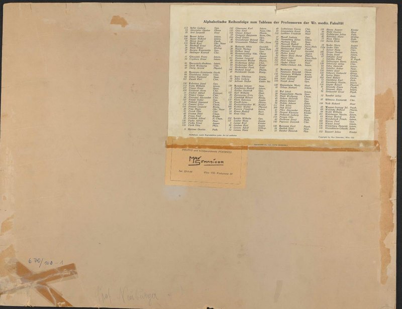 Abgebildet sind: Lauber, Hans, 1876-1952, Tandler, Julius, 1869-1936, Neumann, Heinrich, 1864-1939, Marschik, Hermann, 1878-1969, Frisch, Otto Ritter, 1877-1956, Klein, Salomon, 1845-1937, Bucura, Constantin, 1874-1935, Wagner-Jauregg, Julius, 1857-1940, Sternberg, Carl, 1872-1935, Lorenz, Hans, 1873-1934, Wasicky, Richard, 1884-1970, Fröhlich, Alfred, 1871-1953, Marburg, Otto, 1874-1948, Salzer, Hans, 1871-1944, Sachs, Moriz, 1865-1948, Raimann, Emil, 1872-1949, Schüller, Arthur, 1874-1957, Stein, Robert Otto, 1880-1951, Hajek, Markus, 1861-1941, Weibel, Wilhelm, 1876-1945, Haberda, Albin, 1868-1933, Frankl, Oskar, 1873-1938, Lotheissen, Georg, 1868-1941, Riehl, Gustav, 1855-1943, Wenckebach, Karl Frederik, 1864-1940, Schlesinger, Hermann, 1866-1934, Latzko, Wilhelm, 1863-1945, Wiesel, Josef, -1928, Ewald, Carl, 1865-1950, Mattauschek, Emil, 1870-1935, Fraenkel, Alexander, 1857-1941, Mayer, Otto, 1876-1951, Stigler, Robert, 1878-1975, Freund, Ernst, 1863-1946, Rubritius, Hans, 1876-1943, Schütz, Emil, 1853-, Pick, Ernst Peter, 1872-1960, Economo, Constantin von, 1876-1931, Graßberger, Roland, 1867-1956, Müller-Deham, Albert, 1881-1971, Schwarz, Gottwald, 1880-1959, Hockauf, Josef, 1860-1928, Lindner, Karl, 1883-1961, Kolmer, Walter, 1879-1931, Leiner, Carl, 1871-1930, Erben, Siegmund, 1863-, Sorgo, Josef, 1869-1950, Zappert, Julius, 1867-1942, Ruttin, Erich, 1880-1940, Spitzy, Hans, 1872-1956, Decastello-Rechtwehr, Alfred, 1872-1960, Mannaberg, Julius, 1860-1941, Reichel, Heinrich, 1876-1943, Reuss, August, 1879-1954, Meller, Josef, 1874-1968, Schaffer, Josef, 1861-1939, Hausmann, Walther, 1877-1938, Pichler, Hans, 1877-1949, Ullmann, Emerich, 1861-1937, Peham-Bojernberg, Heinrich Ritter, 1871-1930, Moll, Leopold, 1877-1933, Adler, Ludwig, 1878-1958, Löwenstein, Ernst, 1878-1950, Neuburger, Max, 1868-1955, Sachs, Otto, 1870-1927, Porges, Otto, 1879-1967, Pirquet von Cesenatico, Clemens Peter, 1874-1929, Schur, Heinrich, 1871-1953, Finsterer, Hans, 1877-1955, Hochstetter, Ferdinand, 1861-1954, Hochenegg, Julius von, 1859-1940, Jagić, Nikolaus von, 1875-1956, Blum, Viktor, 1877-1953, Sternberg, Maximilian, 1863-1934, Glaser, Erhard, 1870-1947, Eiselsberg, Anton von, 1860-1939, Winterberg, Heinrich, 1867-1929, Schilder, Paul, 1886-1940, Biehl, Karl, 1869-1945, Berze, Josef, 1866-1957, Bischoff, Ernst, 1868-1957, Lorenz, Adolf, 1854-1946, Falta, Wilhelm, 1875-1950, Mucha, Viktor, 1877-1935, Czyhlarz, Ernst von, 1873-1950, Werner, Paul, 1882-1955, Föderl, Oskar, 1866-1932, Fischel, Alfred, 1868-1938, Fabricius, Josef, 1865-1933, Finger, Ernest, 1856-1939, Denk, Wolfgang, 1882-1970, Fromm, Emil, 1865-1928, Fuchs, Ernst, 1851-1930, Hammerschlag, Victor, 1870-1943, Halban, Josef, 1870-1937, Glässner, Karl, 1876-1944, Fürth, Otto von, 1867-1938, Gaertner, Gustav, 1855-1937, Bauer, Richard, 1879-, Meixner, Karl, 1879-, Nowak, Josef, 1841-1886, Hochsinger, Carl, 1860-1942, Holzknecht, Guido, 1872-1931, Karplus, Johann Paul, 1866-1936, Knöpfelmacher, Wilhelm, 1866-1938, Kerl, Wilhelm, 1880-1945, Keitler, Heinrich, 1874-1937, Jehle, Ludwig, 1871-1939, Jellinek, Stefan, 1871-1968, Neumann, Wilhelm, 1877-1944, Přibram, Ernst, 1879-1940, Kraus, Rudolf, 1868-1932, Kren, Otto, 1876-1937, Bauer, Julius, 1887-1979, Nobl, Gabor, 1864-1938, Strasser, Alois, 1867-1945, Pupovac, Dominik, 1869-1929, Graff, Erwin, 1878-1935, Pappenheim, Martin, 1881-1943, Meyer, Hans Horst, 1853-1939, Pick, Alois, 1859-1945, Kienböck, Robert, 1871-1953, Sträussler, Ernst, 1872-1959, Pilcz, Alexander, 1871-1954, Schnitzler, Julius, 1865-1939, Pal, Jakob, 1863-1936, Oppenheim, Moritz, 1876-1949, Glas, Emil, 1877-1958, Arzt, Leopold, 1883-1955, Volk, Richard, 1876-1944, Pauli, Wolfgang, 1869-1955, Wunschheim-Lilienthal, Gustav Ritter, 1865-1938, Weiser, Rudolf, -1928, Luithlen, Friedrich, 1869-1927, Peters, Hubert, 1859-1934, Piskaček, Ludwig, 1854-1932, Ortner-Bodenstaedt, Norbert Ritter, 1865-1935, Mandl, Ludwig, 1862-1937, Kermauner, Fritz, 1872-1931 Freund, Leopold, 1868-1943 Kaufmann, Rudolf, 1871-1927 Büdinger, Konrad, 1867-1944 Grossman, Michael, 1848-1927 Redlich, Emil, 1866-1930 Harmer, Leopold, 1869-1945 Weinberger, Maximilian, 1875-1954 Chvostek, Franz, 1864-1944 Fronz, Emil, 1860-1930 Durig, Arnold, 1872-1961 Maresch, Rudolf, 1868-1936 Rothberger, Karl Julius, 1871-1945 Frey, Hugo, 1873-1951 Alexander, Gustav, 1873-1932 Russ, Viktor Karl, 1879-1956 Stransky, Erwin, 1877-1962 Nobel, Edmund, 1883-1946 Gomperz, Benjamin, 1861-1935 Knaffl-Lenz-Fohnsdorff, Erich Ritter, 1880-1962 Hanke, Viktor, 1871-1945 Kovács, Friedrich, 1861-1931.
