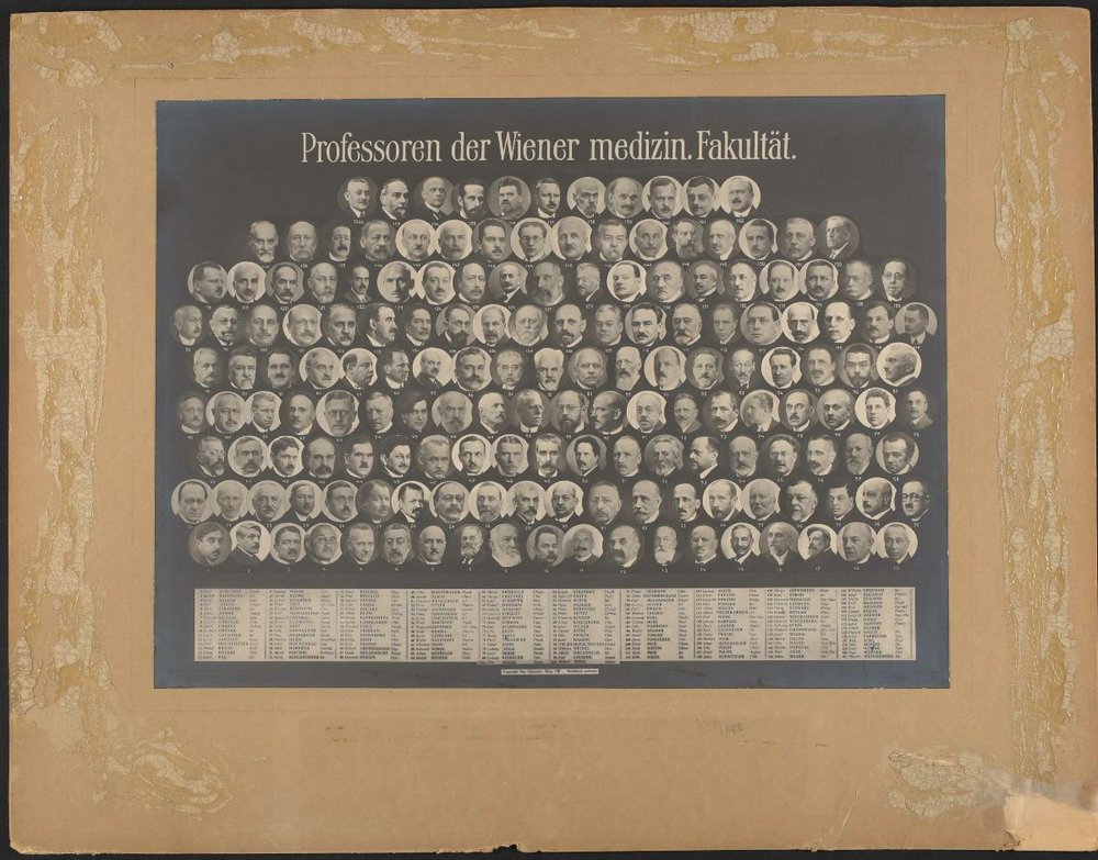 Abgebildet sind: Lauber, Hans, 1876-1952, Tandler, Julius, 1869-1936, Neumann, Heinrich, 1864-1939, Marschik, Hermann, 1878-1969, Frisch, Otto Ritter, 1877-1956, Klein, Salomon, 1845-1937, Bucura, Constantin, 1874-1935, Wagner-Jauregg, Julius, 1857-1940, Sternberg, Carl, 1872-1935, Lorenz, Hans, 1873-1934, Wasicky, Richard, 1884-1970, Fröhlich, Alfred, 1871-1953, Marburg, Otto, 1874-1948, Salzer, Hans, 1871-1944, Sachs, Moriz, 1865-1948, Raimann, Emil, 1872-1949, Schüller, Arthur, 1874-1957, Stein, Robert Otto, 1880-1951, Hajek, Markus, 1861-1941, Weibel, Wilhelm, 1876-1945, Haberda, Albin, 1868-1933, Frankl, Oskar, 1873-1938, Lotheissen, Georg, 1868-1941, Riehl, Gustav, 1855-1943, Wenckebach, Karl Frederik, 1864-1940, Schlesinger, Hermann, 1866-1934, Latzko, Wilhelm, 1863-1945, Wiesel, Josef, -1928, Ewald, Carl, 1865-1950, Mattauschek, Emil, 1870-1935, Fraenkel, Alexander, 1857-1941, Mayer, Otto, 1876-1951, Stigler, Robert, 1878-1975, Freund, Ernst, 1863-1946, Rubritius, Hans, 1876-1943, Schütz, Emil, 1853-, Pick, Ernst Peter, 1872-1960, Economo, Constantin von, 1876-1931, Graßberger, Roland, 1867-1956, Müller-Deham, Albert, 1881-1971, Schwarz, Gottwald, 1880-1959, Hockauf, Josef, 1860-1928, Lindner, Karl, 1883-1961, Kolmer, Walter, 1879-1931, Leiner, Carl, 1871-1930, Erben, Siegmund, 1863-, Sorgo, Josef, 1869-1950, Zappert, Julius, 1867-1942, Ruttin, Erich, 1880-1940, Spitzy, Hans, 1872-1956, Decastello-Rechtwehr, Alfred, 1872-1960, Mannaberg, Julius, 1860-1941, Reichel, Heinrich, 1876-1943, Reuss, August, 1879-1954, Meller, Josef, 1874-1968, Schaffer, Josef, 1861-1939, Hausmann, Walther, 1877-1938, Pichler, Hans, 1877-1949, Ullmann, Emerich, 1861-1937, Peham-Bojernberg, Heinrich Ritter, 1871-1930, Moll, Leopold, 1877-1933, Adler, Ludwig, 1878-1958, Löwenstein, Ernst, 1878-1950, Neuburger, Max, 1868-1955, Sachs, Otto, 1870-1927, Porges, Otto, 1879-1967, Pirquet von Cesenatico, Clemens Peter, 1874-1929, Schur, Heinrich, 1871-1953, Finsterer, Hans, 1877-1955, Hochstetter, Ferdinand, 1861-1954, Hochenegg, Julius von, 1859-1940, Jagić, Nikolaus von, 1875-1956, Blum, Viktor, 1877-1953, Sternberg, Maximilian, 1863-1934, Glaser, Erhard, 1870-1947, Eiselsberg, Anton von, 1860-1939, Winterberg, Heinrich, 1867-1929, Schilder, Paul, 1886-1940, Biehl, Karl, 1869-1945, Berze, Josef, 1866-1957, Bischoff, Ernst, 1868-1957, Lorenz, Adolf, 1854-1946, Falta, Wilhelm, 1875-1950, Mucha, Viktor, 1877-1935, Czyhlarz, Ernst von, 1873-1950, Werner, Paul, 1882-1955, Föderl, Oskar, 1866-1932, Fischel, Alfred, 1868-1938, Fabricius, Josef, 1865-1933, Finger, Ernest, 1856-1939, Denk, Wolfgang, 1882-1970, Fromm, Emil, 1865-1928, Fuchs, Ernst, 1851-1930, Hammerschlag, Victor, 1870-1943, Halban, Josef, 1870-1937, Glässner, Karl, 1876-1944, Fürth, Otto von, 1867-1938, Gaertner, Gustav, 1855-1937, Bauer, Richard, 1879-, Meixner, Karl, 1879-, Nowak, Josef, 1841-1886, Hochsinger, Carl, 1860-1942, Holzknecht, Guido, 1872-1931, Karplus, Johann Paul, 1866-1936, Knöpfelmacher, Wilhelm, 1866-1938, Kerl, Wilhelm, 1880-1945, Keitler, Heinrich, 1874-1937, Jehle, Ludwig, 1871-1939, Jellinek, Stefan, 1871-1968, Neumann, Wilhelm, 1877-1944, Přibram, Ernst, 1879-1940, Kraus, Rudolf, 1868-1932, Kren, Otto, 1876-1937, Bauer, Julius, 1887-1979, Nobl, Gabor, 1864-1938, Strasser, Alois, 1867-1945, Pupovac, Dominik, 1869-1929, Graff, Erwin, 1878-1935, Pappenheim, Martin, 1881-1943, Meyer, Hans Horst, 1853-1939, Pick, Alois, 1859-1945, Kienböck, Robert, 1871-1953, Sträussler, Ernst, 1872-1959, Pilcz, Alexander, 1871-1954, Schnitzler, Julius, 1865-1939, Pal, Jakob, 1863-1936, Oppenheim, Moritz, 1876-1949, Glas, Emil, 1877-1958, Arzt, Leopold, 1883-1955, Volk, Richard, 1876-1944, Pauli, Wolfgang, 1869-1955, Wunschheim-Lilienthal, Gustav Ritter, 1865-1938, Weiser, Rudolf, -1928, Luithlen, Friedrich, 1869-1927, Peters, Hubert, 1859-1934, Piskaček, Ludwig, 1854-1932, Ortner-Bodenstaedt, Norbert Ritter, 1865-1935, Mandl, Ludwig, 1862-1937, Kermauner, Fritz, 1872-1931 Freund, Leopold, 1868-1943 Kaufmann, Rudolf, 1871-1927 Büdinger, Konrad, 1867-1944 Grossman, Michael, 1848-1927 Redlich, Emil, 1866-1930 Harmer, Leopold, 1869-1945 Weinberger, Maximilian, 1875-1954 Chvostek, Franz, 1864-1944 Fronz, Emil, 1860-1930 Durig, Arnold, 1872-1961 Maresch, Rudolf, 1868-1936 Rothberger, Karl Julius, 1871-1945 Frey, Hugo, 1873-1951 Alexander, Gustav, 1873-1932 Russ, Viktor Karl, 1879-1956 Stransky, Erwin, 1877-1962 Nobel, Edmund, 1883-1946 Gomperz, Benjamin, 1861-1935 Knaffl-Lenz-Fohnsdorff, Erich Ritter, 1880-1962 Hanke, Viktor, 1871-1945 Kovács, Friedrich, 1861-1931.