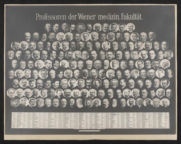 Abgebildet sind: Lauber, Hans, 1876-1952, Tandler, Julius, 1869-1936, Neumann, Heinrich, 1864-1939, Marschik, Hermann, 1878-1969, Frisch, Otto Ritter, 1877-1956, Klein, Salomon, 1845-1937, Bucura, Constantin, 1874-1935, Wagner-Jauregg, Julius, 1857-1940, Sternberg, Carl, 1872-1935, Lorenz, Hans, 1873-1934, Wasicky, Richard, 1884-1970, Fröhlich, Alfred, 1871-1953, Marburg, Otto, 1874-1948, Salzer, Hans, 1871-1944, Sachs, Moriz, 1865-1948, Raimann, Emil, 1872-1949, Schüller, Arthur, 1874-1957, Stein, Robert Otto, 1880-1951, Hajek, Markus, 1861-1941, Weibel, Wilhelm, 1876-1945, Haberda, Albin, 1868-1933, Frankl, Oskar, 1873-1938, Lotheissen, Georg, 1868-1941, Riehl, Gustav, 1855-1943, Wenckebach, Karl Frederik, 1864-1940, Schlesinger, Hermann, 1866-1934, Latzko, Wilhelm, 1863-1945, Wiesel, Josef, -1928, Ewald, Carl, 1865-1950, Mattauschek, Emil, 1870-1935, Fraenkel, Alexander, 1857-1941, Mayer, Otto, 1876-1951, Stigler, Robert, 1878-1975, Freund, Ernst, 1863-1946, Rubritius, Hans, 1876-1943, Schütz, Emil, 1853-, Pick, Ernst Peter, 1872-1960, Economo, Constantin von, 1876-1931, Graßberger, Roland, 1867-1956, Müller-Deham, Albert, 1881-1971, Schwarz, Gottwald, 1880-1959, Hockauf, Josef, 1860-1928, Lindner, Karl, 1883-1961, Kolmer, Walter, 1879-1931, Leiner, Carl, 1871-1930, Erben, Siegmund, 1863-, Sorgo, Josef, 1869-1950, Zappert, Julius, 1867-1942, Ruttin, Erich, 1880-1940, Spitzy, Hans, 1872-1956, Decastello-Rechtwehr, Alfred, 1872-1960, Mannaberg, Julius, 1860-1941, Reichel, Heinrich, 1876-1943, Reuss, August, 1879-1954, Meller, Josef, 1874-1968, Schaffer, Josef, 1861-1939, Hausmann, Walther, 1877-1938, Pichler, Hans, 1877-1949, Ullmann, Emerich, 1861-1937, Peham-Bojernberg, Heinrich Ritter, 1871-1930, Moll, Leopold, 1877-1933, Adler, Ludwig, 1878-1958, Löwenstein, Ernst, 1878-1950, Neuburger, Max, 1868-1955, Sachs, Otto, 1870-1927, Porges, Otto, 1879-1967, Pirquet von Cesenatico, Clemens Peter, 1874-1929, Schur, Heinrich, 1871-1953, Finsterer, Hans, 1877-1955, Hochstetter, Ferdinand, 1861-1954, Hochenegg, Julius von, 1859-1940, Jagić, Nikolaus von, 1875-1956, Blum, Viktor, 1877-1953, Sternberg, Maximilian, 1863-1934, Glaser, Erhard, 1870-1947, Eiselsberg, Anton von, 1860-1939, Winterberg, Heinrich, 1867-1929, Schilder, Paul, 1886-1940, Biehl, Karl, 1869-1945, Berze, Josef, 1866-1957, Bischoff, Ernst, 1868-1957, Lorenz, Adolf, 1854-1946, Falta, Wilhelm, 1875-1950, Mucha, Viktor, 1877-1935, Czyhlarz, Ernst von, 1873-1950, Werner, Paul, 1882-1955, Föderl, Oskar, 1866-1932, Fischel, Alfred, 1868-1938, Fabricius, Josef, 1865-1933, Finger, Ernest, 1856-1939, Denk, Wolfgang, 1882-1970, Fromm, Emil, 1865-1928, Fuchs, Ernst, 1851-1930, Hammerschlag, Victor, 1870-1943, Halban, Josef, 1870-1937, Glässner, Karl, 1876-1944, Fürth, Otto von, 1867-1938, Gaertner, Gustav, 1855-1937, Bauer, Richard, 1879-, Meixner, Karl, 1879-, Nowak, Josef, 1841-1886, Hochsinger, Carl, 1860-1942, Holzknecht, Guido, 1872-1931, Karplus, Johann Paul, 1866-1936, Knöpfelmacher, Wilhelm, 1866-1938, Kerl, Wilhelm, 1880-1945, Keitler, Heinrich, 1874-1937, Jehle, Ludwig, 1871-1939, Jellinek, Stefan, 1871-1968, Neumann, Wilhelm, 1877-1944, Přibram, Ernst, 1879-1940, Kraus, Rudolf, 1868-1932, Kren, Otto, 1876-1937, Bauer, Julius, 1887-1979, Nobl, Gabor, 1864-1938, Strasser, Alois, 1867-1945, Pupovac, Dominik, 1869-1929, Graff, Erwin, 1878-1952, Pappenheim, Martin, 1881-1943, Meyer, Hans Horst, 1853-1939, Pick, Alois, 1859-1945, Kienböck, Robert, 1871-1953, Sträussler, Ernst, 1872-1959, Pilcz, Alexander, 1871-1954, Schnitzler, Julius, 1865-1939, Pal, Jakob, 1863-1936, Oppenheim, Moritz, 1876-1949, Glas, Emil, 1877-1958, Arzt, Leopold, 1883-1955, Volk, Richard, 1876-1944, Pauli, Wolfgang, 1869-1955, Wunschheim-Lilienthal, Gustav Ritter, 1865-1938, Weiser, Rudolf, -1928, Luithlen, Friedrich, 1869-1927, Peters, Hubert, 1859-1934, Piskaček, Ludwig, 1854-1932, Ortner-Bodenstaedt, Norbert Ritter, 1865-1935, Mandl, Ludwig, 1862-1937, Kermauner, Fritz, 1872-1931 Freund, Leopold, 1868-1943 Kaufmann, Rudolf, 1871-1927 Büdinger, Konrad, 1867-1944 Grossman, Michael, 1848-1927 Redlich, Emil, 1866-1930 Harmer, Leopold, 1869-1945 Weinberger, Maximilian, 1875-1954 Chvostek, Franz, 1864-1944 Fronz, Emil, 1860-1930 Durig, Arnold, 1872-1961 Maresch, Rudolf, 1868-1936 Rothberger, Karl Julius, 1871-1945 Frey, Hugo, 1873-1951 Alexander, Gustav, 1873-1932 Russ, Viktor Karl, 1879-1956 Stransky, Erwin, 1877-1962 Nobel, Edmund, 1883-1946 Gomperz, Benjamin, 1861-1935 Knaffl-Lenz-Fohnsdorff, Erich Ritter, 1880-1962 Hanke, Viktor, 1871-1945 Kovács, Friedrich, 1861-1931.