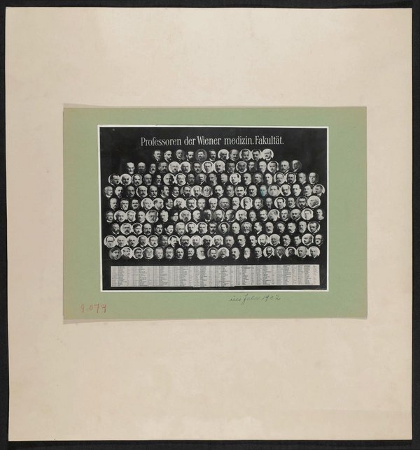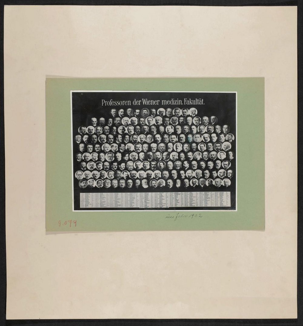 Abgebildet sind: Lauber, Hans, 1876-1952, Tandler, Julius, 1869-1936, Neumann, Heinrich, 1864-1939, Marschik, Hermann, 1878-1969, Frisch, Otto Ritter, 1877-1956, Klein, Salomon, 1845-1937, Bucura, Constantin, 1874-1935, Wagner-Jauregg, Julius, 1857-1940, Sternberg, Carl, 1872-1935, Lorenz, Hans, 1873-1934, Wasicky, Richard, 1884-1970, Fröhlich, Alfred, 1871-1953, Marburg, Otto, 1874-1948, Salzer, Hans, 1871-1944, Sachs, Moriz, 1865-1948, Raimann, Emil, 1872-1949, Schüller, Arthur, 1874-1957, Stein, Robert Otto, 1880-1951, Hajek, Markus, 1861-1941, Weibel, Wilhelm, 1876-1945, Haberda, Albin, 1868-1933, Frankl, Oskar, 1873-1938, Lotheissen, Georg, 1868-1941, Riehl, Gustav, 1855-1943, Wenckebach, Karl Frederik, 1864-1940, Schlesinger, Hermann, 1866-1934, Latzko, Wilhelm, 1863-1945, Wiesel, Josef, -1928, Ewald, Carl, 1865-1950, Mattauschek, Emil, 1870-1935, Fraenkel, Alexander, 1857-1941, Mayer, Otto, 1876-1951, Stigler, Robert, 1878-1975, Freund, Ernst, 1863-1946, Rubritius, Hans, 1876-1943, Schütz, Emil, 1853-, Pick, Ernst Peter, 1872-1960, Economo, Constantin von, 1876-1931, Graßberger, Roland, 1867-1956, Müller-Deham, Albert, 1881-1971, Schwarz, Gottwald, 1880-1959, Hockauf, Josef, 1860-1928, Lindner, Karl, 1883-1961, Kolmer, Walter, 1879-1931, Leiner, Carl, 1871-1930, Erben, Siegmund, 1863-, Sorgo, Josef, 1869-1950, Zappert, Julius, 1867-1942, Ruttin, Erich, 1880-1940, Spitzy, Hans, 1872-1956, Decastello-Rechtwehr, Alfred, 1872-1960, Mannaberg, Julius, 1860-1941, Reichel, Heinrich, 1876-1943, Reuss, August, 1879-1954, Meller, Josef, 1874-1968, Schaffer, Josef, 1861-1939, Hausmann, Walther, 1877-1938, Pichler, Hans, 1877-1949, Ullmann, Emerich, 1861-1937, Peham-Bojernberg, Heinrich Ritter, 1871-1930, Moll, Leopold, 1877-1933, Adler, Ludwig, 1878-1958, Löwenstein, Ernst, 1878-1950, Neuburger, Max, 1868-1955, Sachs, Otto, 1870-1927, Porges, Otto, 1879-1967, Pirquet von Cesenatico, Clemens Peter, 1874-1929, Schur, Heinrich, 1871-1953, Finsterer, Hans, 1877-1955, Hochstetter, Ferdinand, 1861-1954, Hochenegg, Julius von, 1859-1940, Jagić, Nikolaus von, 1875-1956, Blum, Viktor, 1877-1953, Sternberg, Maximilian, 1863-1934, Glaser, Erhard, 1870-1947, Eiselsberg, Anton von, 1860-1939, Winterberg, Heinrich, 1867-1929, Schilder, Paul, 1886-1940, Biehl, Karl, 1869-1945, Berze, Josef, 1866-1957, Bischoff, Ernst, 1868-1957, Lorenz, Adolf, 1854-1946, Falta, Wilhelm, 1875-1950, Mucha, Viktor, 1877-1935, Czyhlarz, Ernst von, 1873-1950, Werner, Paul, 1882-1955, Föderl, Oskar, 1866-1932, Fischel, Alfred, 1868-1938, Fabricius, Josef, 1865-1933, Finger, Ernest, 1856-1939, Denk, Wolfgang, 1882-1970, Fromm, Emil, 1865-1928, Fuchs, Ernst, 1851-1930, Hammerschlag, Victor, 1870-1943, Halban, Josef, 1870-1937, Glässner, Karl, 1876-1944, Fürth, Otto von, 1867-1938, Gaertner, Gustav, 1855-1937, Bauer, Richard, 1879-, Meixner, Karl, 1879-, Nowak, Josef, 1841-1886, Hochsinger, Carl, 1860-1942, Holzknecht, Guido, 1872-1931, Karplus, Johann Paul, 1866-1936, Knöpfelmacher, Wilhelm, 1866-1938, Kerl, Wilhelm, 1880-1945, Keitler, Heinrich, 1874-1937, Jehle, Ludwig, 1871-1939, Jellinek, Stefan, 1871-1968, Neumann, Wilhelm, 1877-1944, Přibram, Ernst, 1879-1940, Kraus, Rudolf, 1868-1932, Kren, Otto, 1876-1937, Bauer, Julius, 1887-1979, Nobl, Gabor, 1864-1938, Strasser, Alois, 1867-1945, Pupovac, Dominik, 1869-1929, Graff, Erwin, 1878-1952, Pappenheim, Martin, 1881-1943, Meyer, Hans Horst, 1853-1939, Pick, Alois, 1859-1945, Kienböck, Robert, 1871-1953, Sträussler, Ernst, 1872-1959, Pilcz, Alexander, 1871-1954, Schnitzler, Julius, 1865-1939, Pal, Jakob, 1863-1936, Oppenheim, Moritz, 1876-1949, Glas, Emil, 1877-1958, Arzt, Leopold, 1883-1955, Volk, Richard, 1876-1944, Pauli, Wolfgang, 1869-1955, Wunschheim-Lilienthal, Gustav Ritter, 1865-1938, Weiser, Rudolf, -1928, Luithlen, Friedrich, 1869-1927, Peters, Hubert, 1859-1934, Piskaček, Ludwig, 1854-1932, Ortner-Bodenstaedt, Norbert Ritter, 1865-1935, Mandl, Ludwig, 1862-1937, Kermauner, Fritz, 1872-1931 Freund, Leopold, 1868-1943 Kaufmann, Rudolf, 1871-1927 Büdinger, Konrad, 1867-1944 Grossman, Michael, 1848-1927 Redlich, Emil, 1866-1930 Harmer, Leopold, 1869-1945 Weinberger, Maximilian, 1875-1954 Chvostek, Franz, 1864-1944 Fronz, Emil, 1860-1930 Durig, Arnold, 1872-1961 Maresch, Rudolf, 1868-1936 Rothberger, Karl Julius, 1871-1945 Frey, Hugo, 1873-1951 Alexander, Gustav, 1873-1932 Russ, Viktor Karl, 1879-1956 Stransky, Erwin, 1877-1962 Nobel, Edmund, 1883-1946 Gomperz, Benjamin, 1861-1935 Knaffl-Lenz-Fohnsdorff, Erich Ritter, 1880-1962 Hanke, Viktor, 1871-1945 Kovács, Friedrich, 1861-1931.
