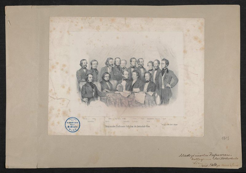 Die Abbildung ist Seitenverkehrt. Zeichnung von August Prinzhofer, Druck von Johann Rauh. Vorderseitig mit einem Stempel des Instituts für Geschichte der Medizin, Wien, versehen.