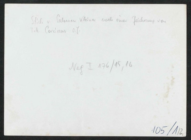 Als Vorlage diente ein Druck, der wiederum auf einem Stich von Salomon Kleiner basierte, dessen Vorlage eine Zeichnung von Johann August Corvinus war. Neg I 176/15, 16