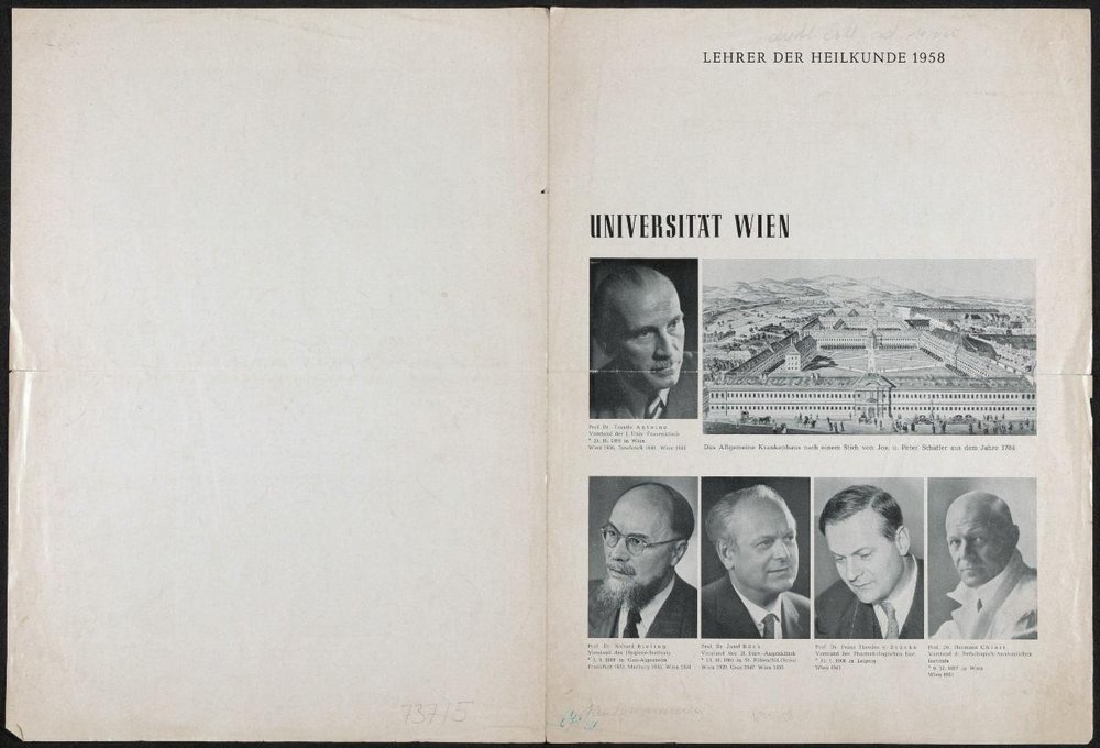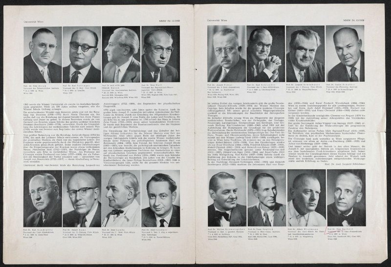 Die Bilder sind in einem Prospekt der Universität Wien zu den Lehrenden der Heilkunde, MMW Nr. 15, 1958, entnommen worden.