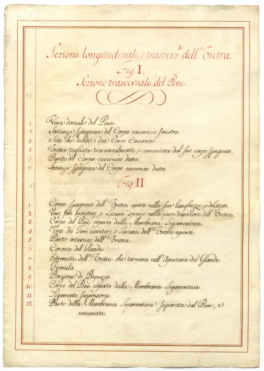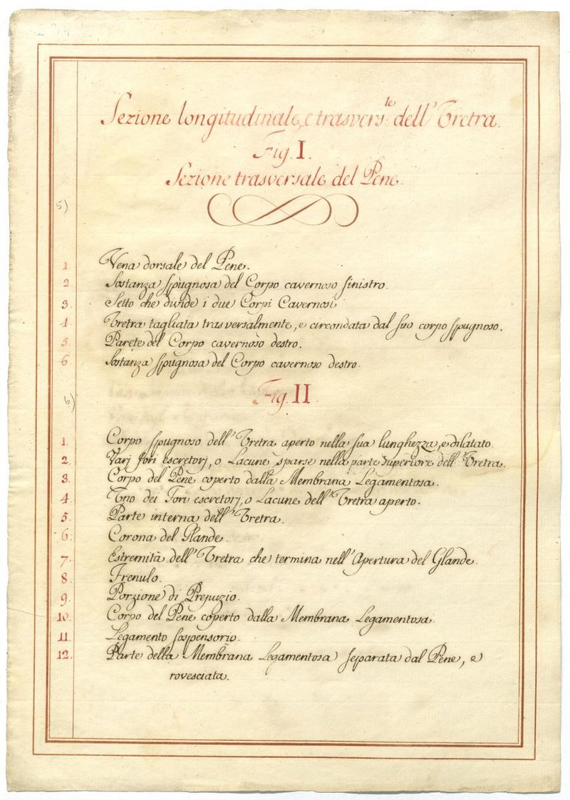Der Text ist die ergänzende Beschreibung in italienischer Sprache zum anatomischen Wachsmodell der äußeren männlichen Genitale.