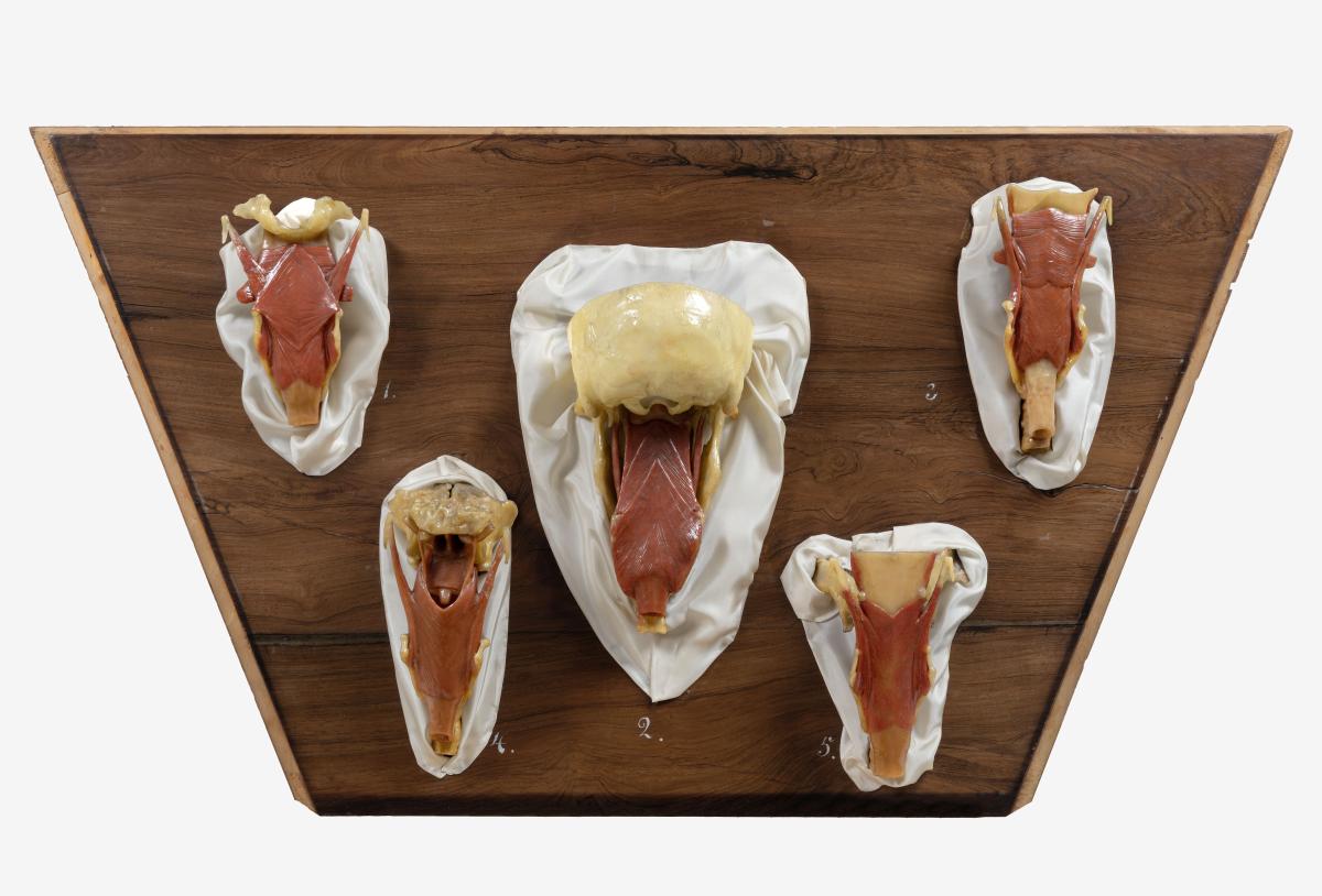 In dieser Modellserie sind die unterschiedlichen Rachenmuskeln dargestellt. Hierbei ist jeweils der Relevante Knochenteil der Schädelbasis (z.B. Processus styloideus beim Musculus stylopharyngeus) inkludiert. 1. Musculi constrictores pharyngis und Musculi stylopharyngei. 2. Musculi constrictores pharyngis und Musculi styloglossi. 3. Musculi constrictores pharyngis, Musculus stylopharyngeus und dessen gemeinsame Einstrahlung mit dem Musculus palatopharyngeus. 4. Musculus palatopharyngeus) Musculus stylopharyngeus und Musculus salpingopharyngeus. 5. Musculus palatopharyngeus und Musculus stylopharyngeus.